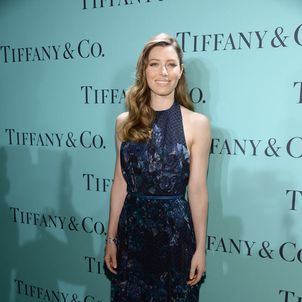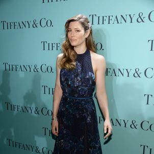 Jessica Biel attended the Tiffany & Co. Blue Book Ball on April 18th, wearing a navy sleeveless gown with floral print and sheer panel detailing from Elie Saab’s fall 2013 collection. The actress wore her hair in retro waves with Tiffany jewelry.