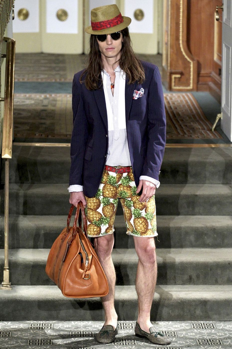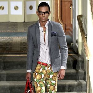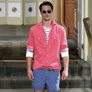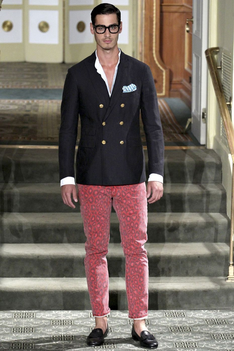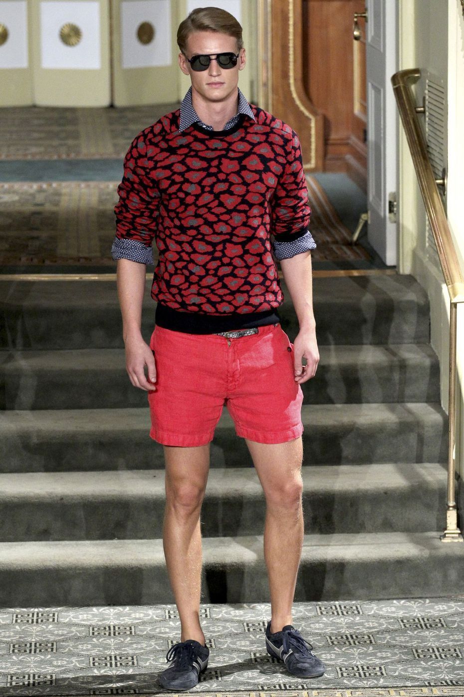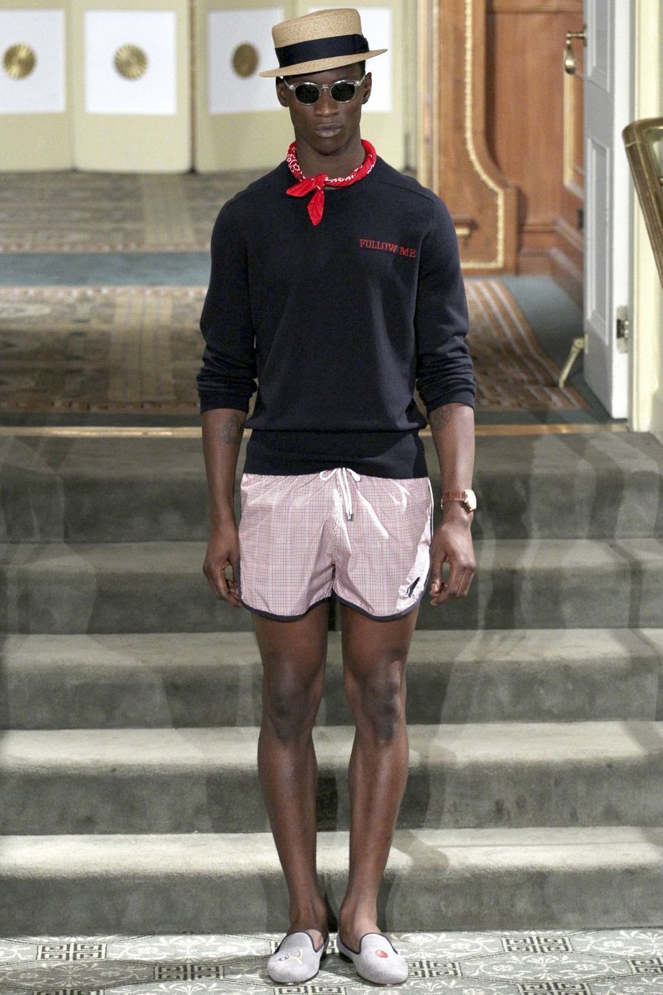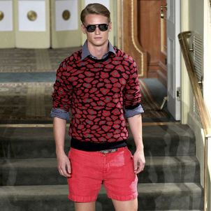New York-born designer Michael Bastian looked to 1950 and 1960s French cinema for his latest collection. In particular, Bastian was inspired by the 1956 film The Red Balloon and the 2003 film, The Dreamers, set in Paris during the sexually-liberating 1960s. Frilly prints like pineapples on pants and cheetah patterns on jumpers and slim belts were mixed with signature Bastian pieces like rugby polos and sexy and cropped shorts.