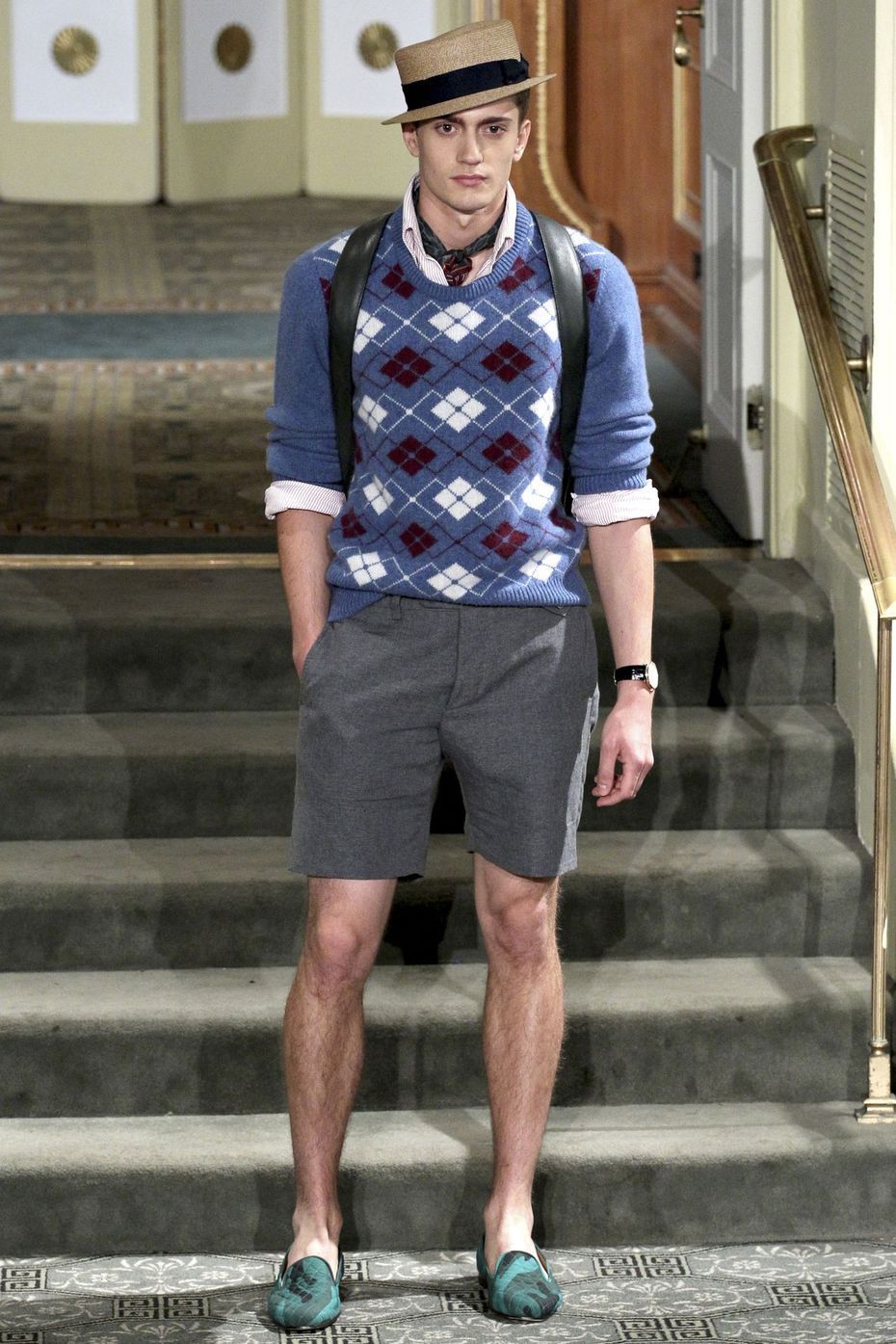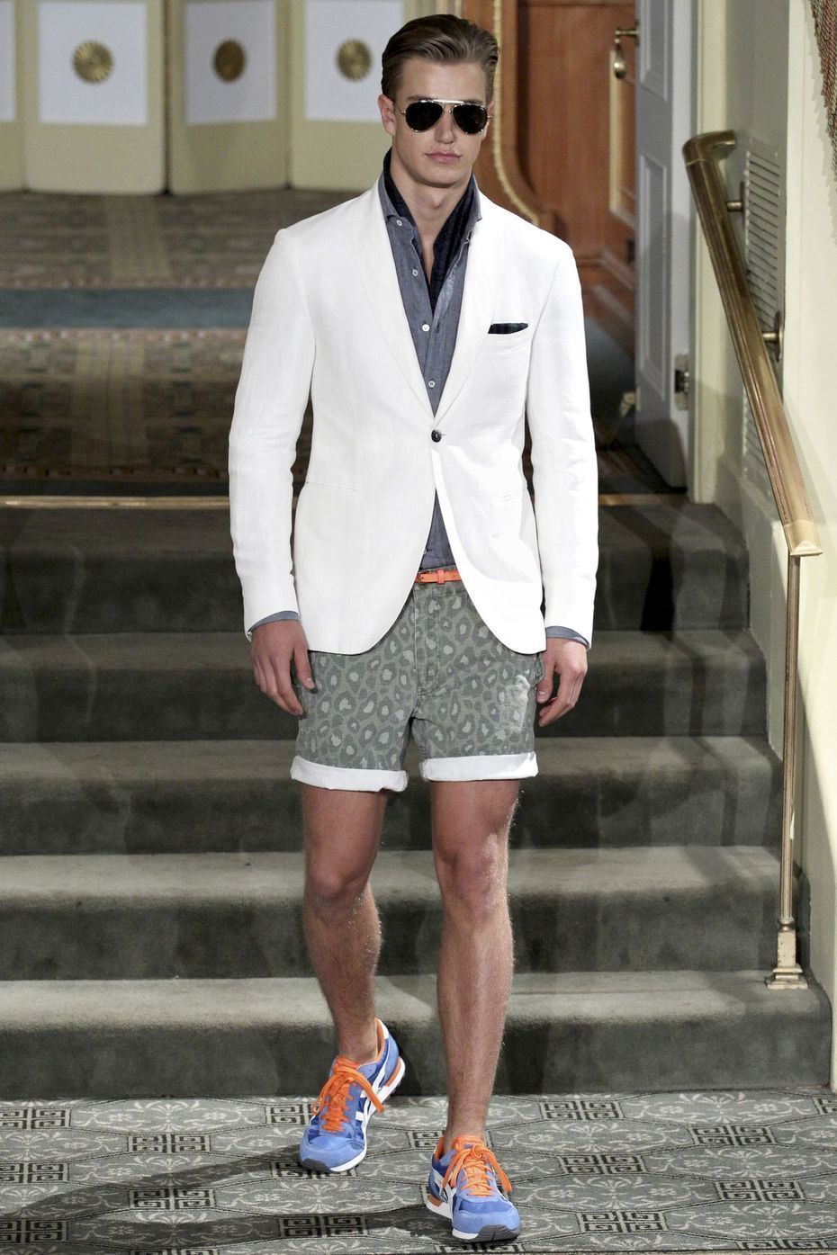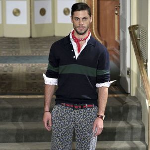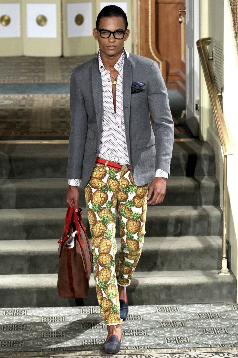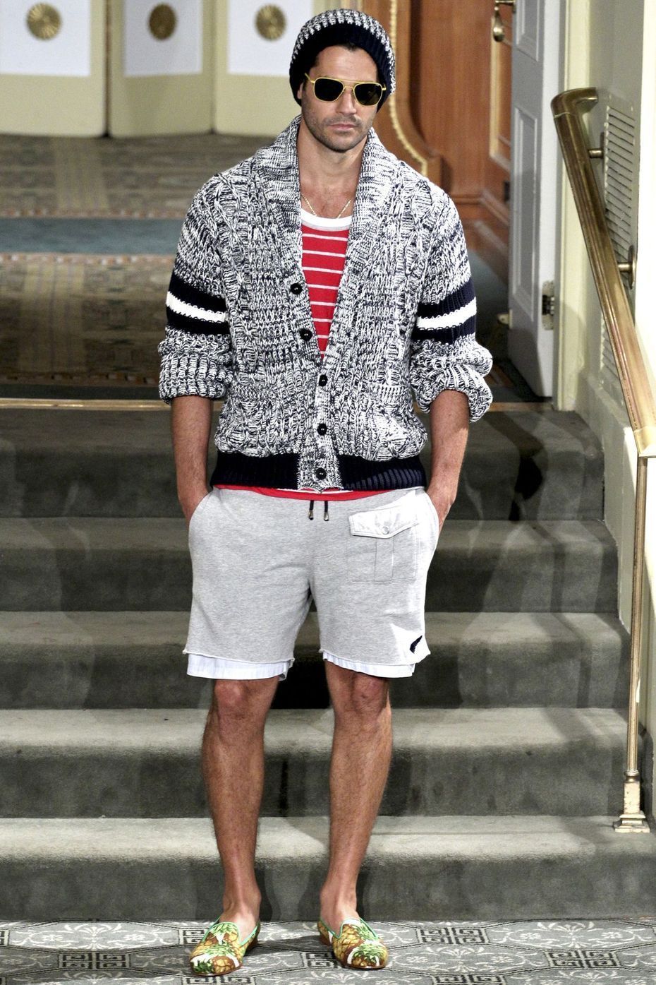 New York-born designer Michael Bastian looked to 1950 and 1960s French cinema for his latest collection. In particular, Bastian was inspired by the 1956 film The Red Balloon and the 2003 film, The Dreamers, set in Paris during the sexually-liberating 1960s. Frilly prints like pineapples on pants and cheetah patterns on jumpers and slim belts were mixed with signature Bastian pieces like rugby polos and sexy and cropped shorts.