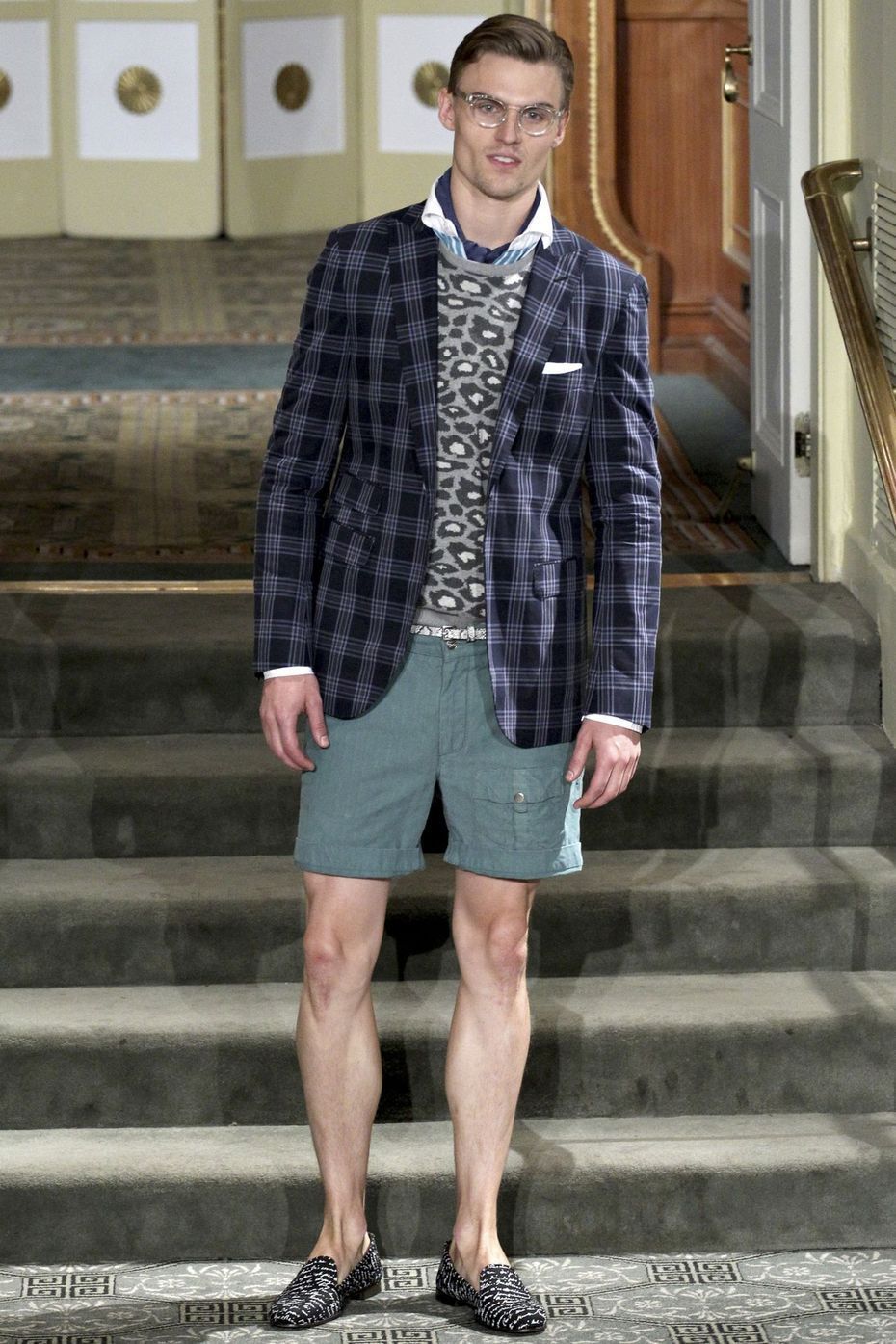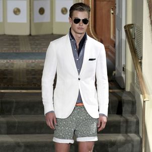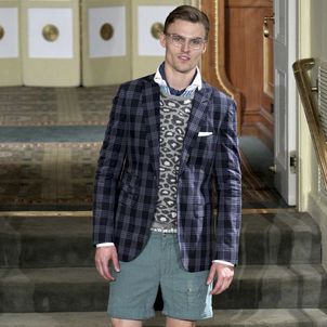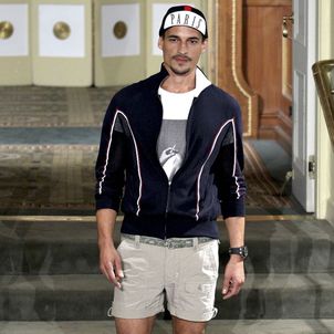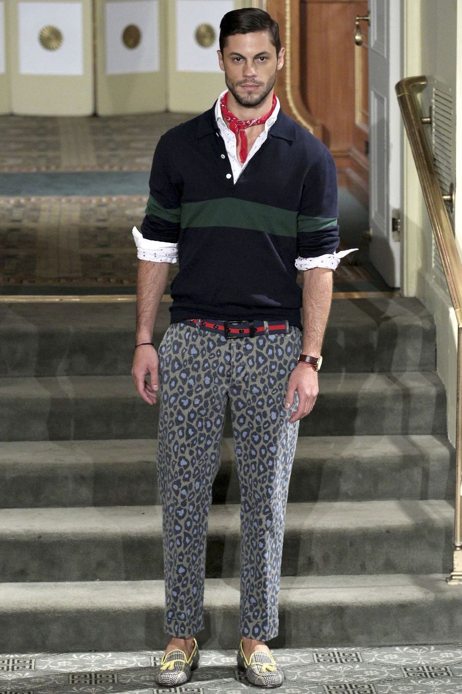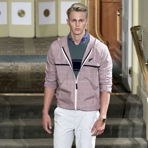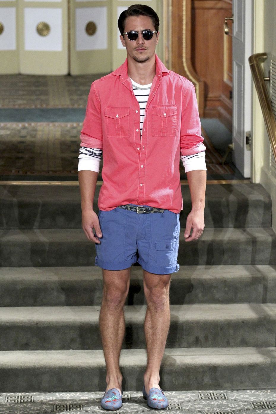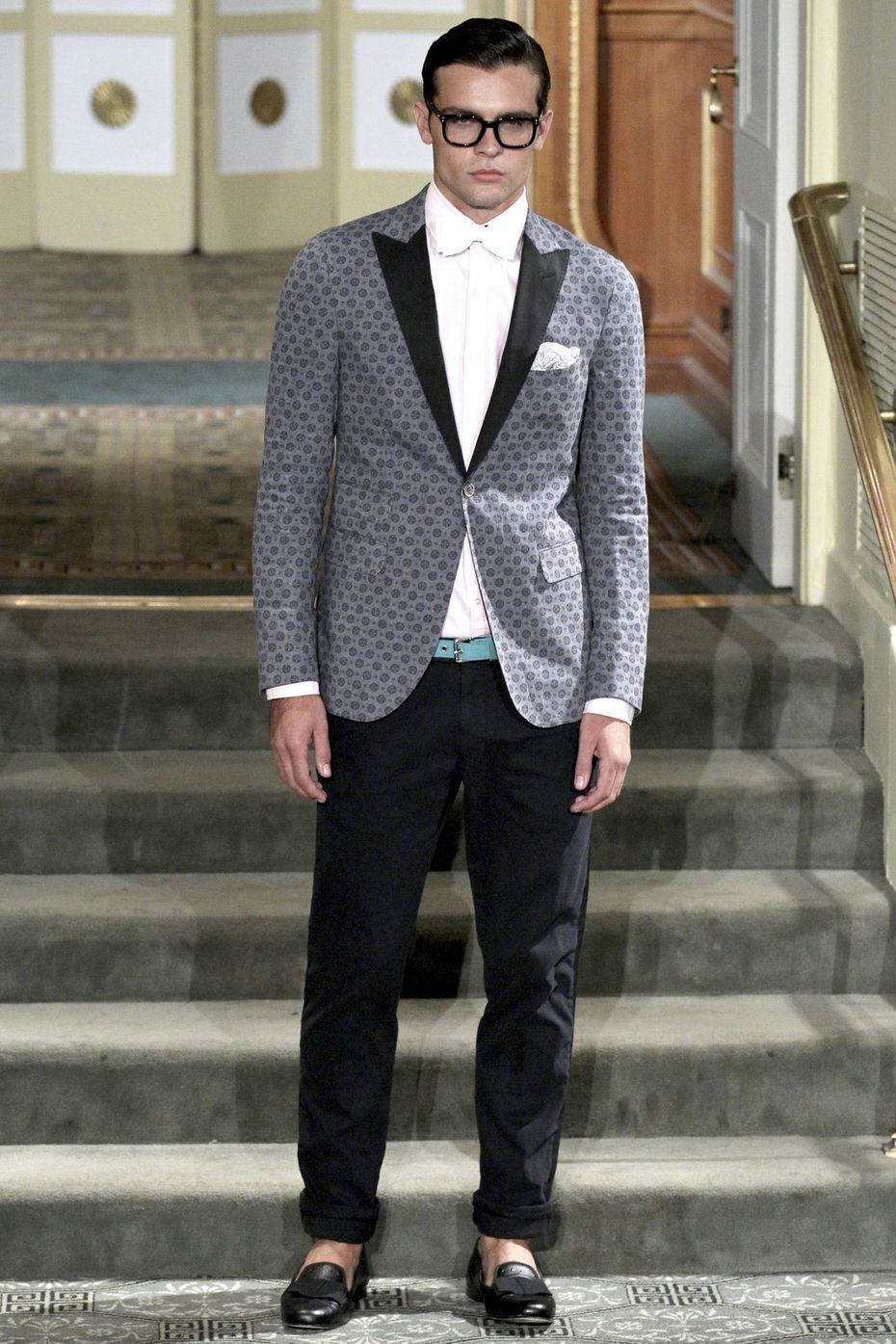New York-born designer Michael Bastian looked to 1950 and 1960s French cinema for his latest collection. In particular, Bastian was inspired by the 1956 film The Red Balloon and the 2003 film, The Dreamers, set in Paris during the sexually-liberating 1960s. Frilly prints like pineapples on pants and cheetah patterns on jumpers and slim belts were mixed with signature Bastian pieces like rugby polos and sexy and cropped shorts.