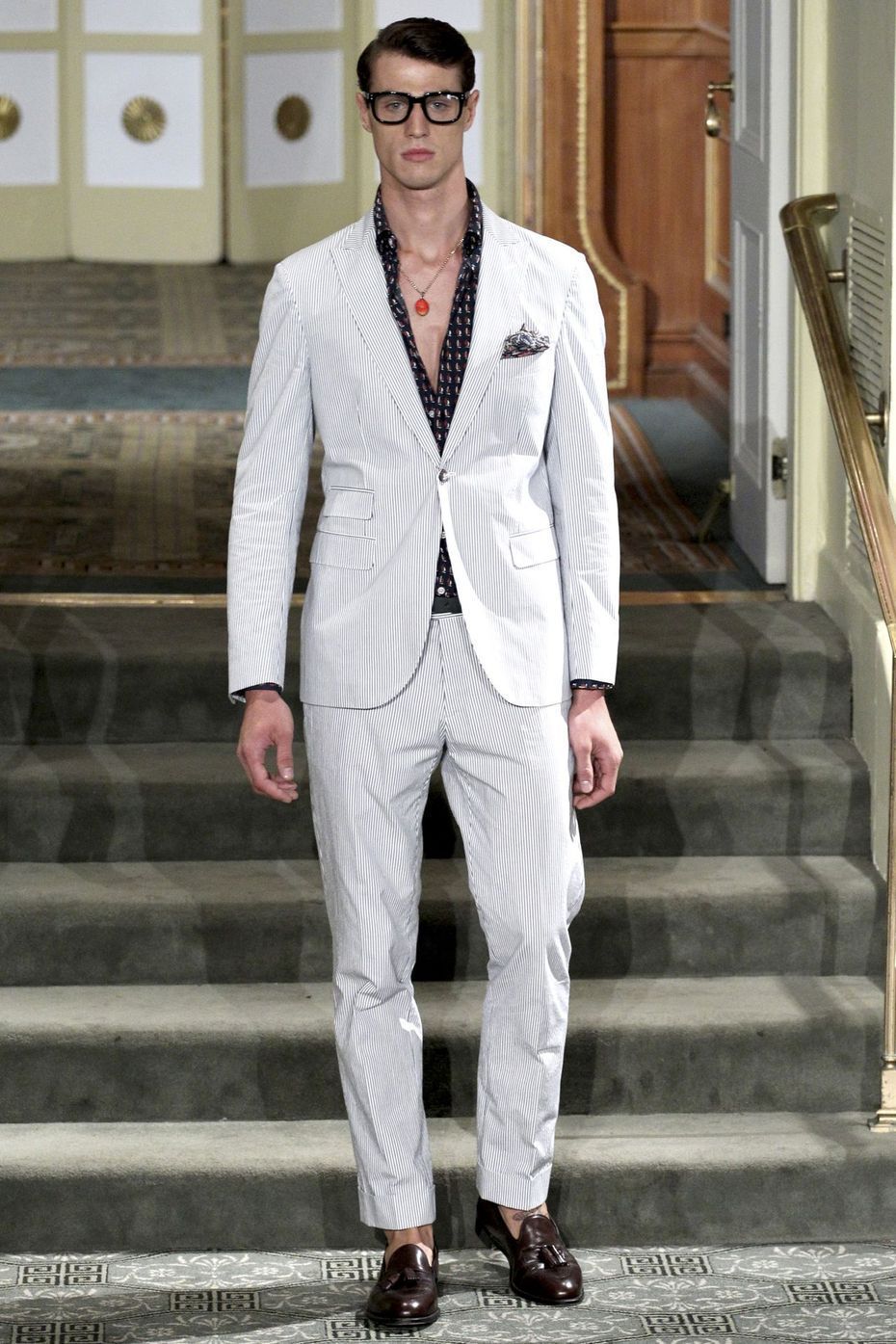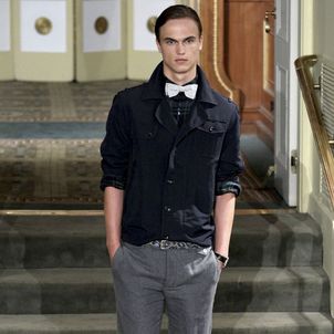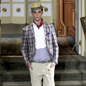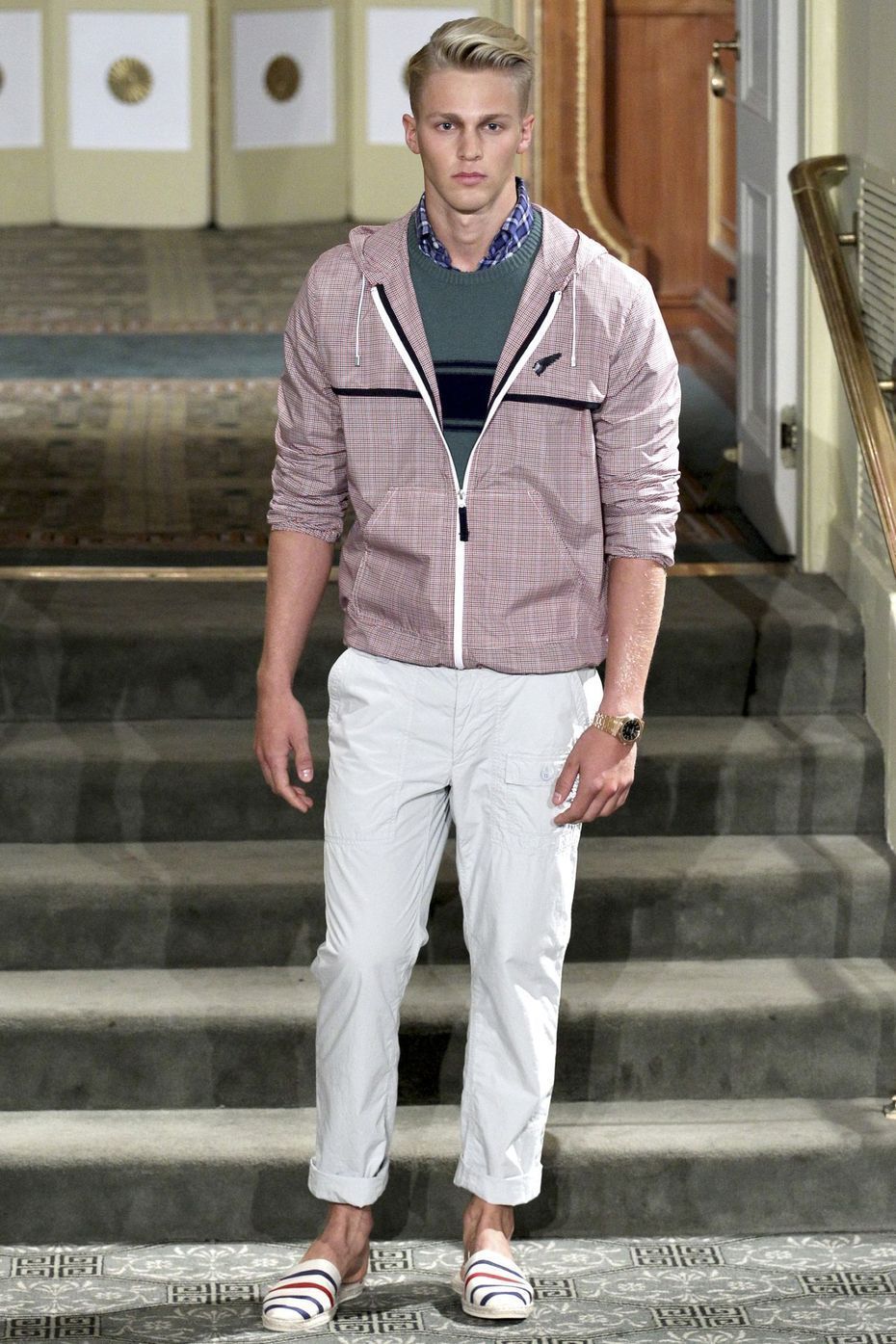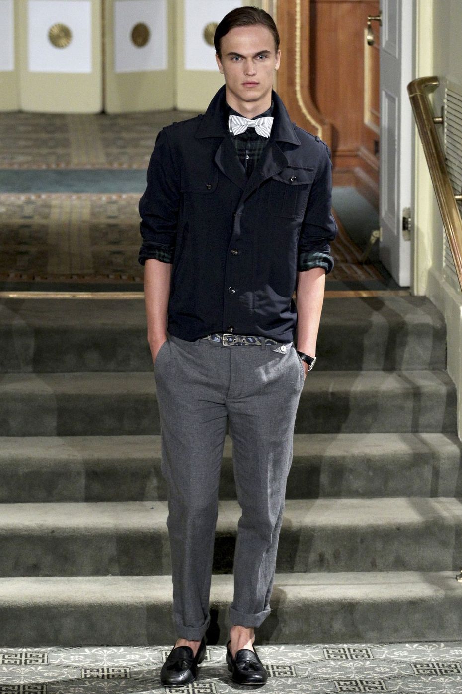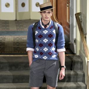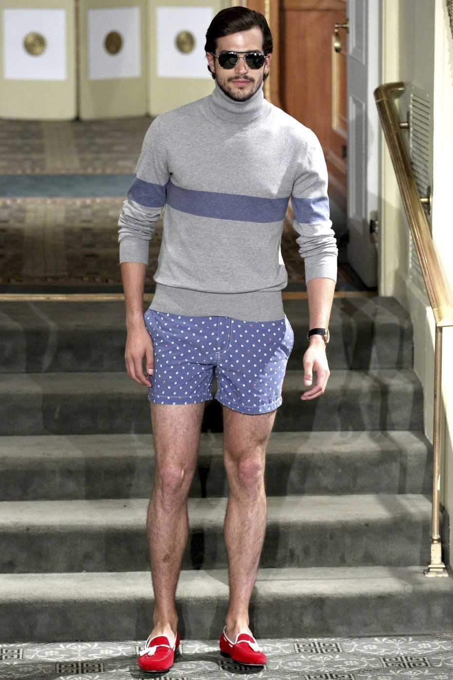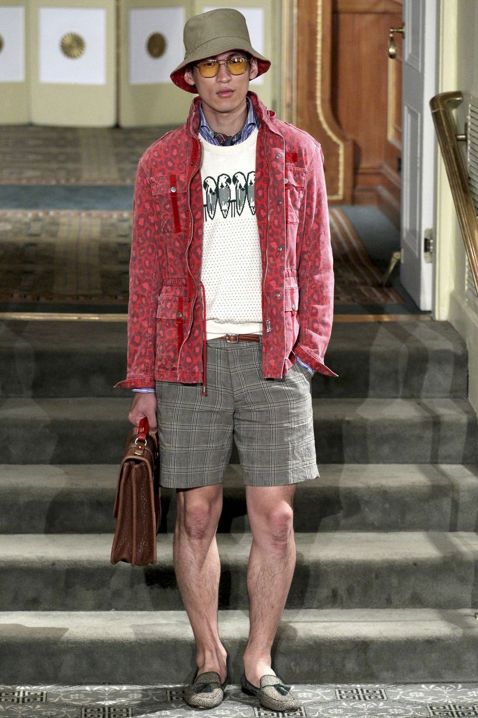 New York-born designer Michael Bastian looked to 1950 and 1960s French cinema for his latest collection. In particular, Bastian was inspired by the 1956 film The Red Balloon and the 2003 film, The Dreamers, set in Paris during the sexually-liberating 1960s. Frilly prints like pineapples on pants and cheetah patterns on jumpers and slim belts were mixed with signature Bastian pieces like rugby polos and sexy and cropped shorts.