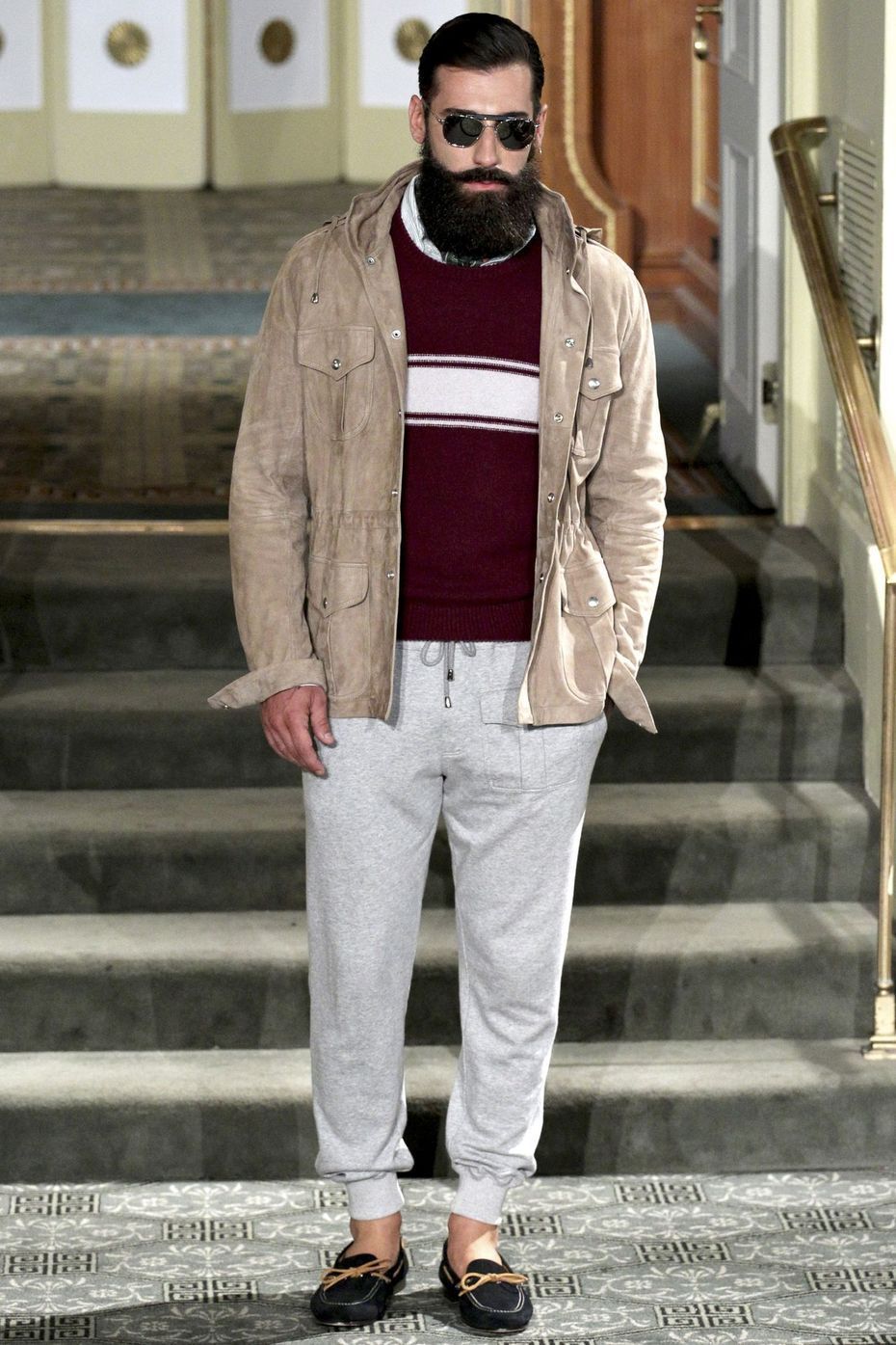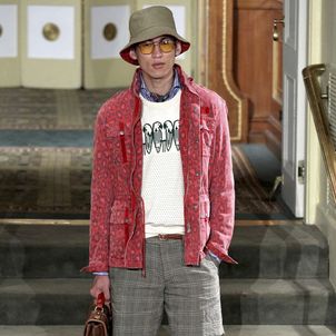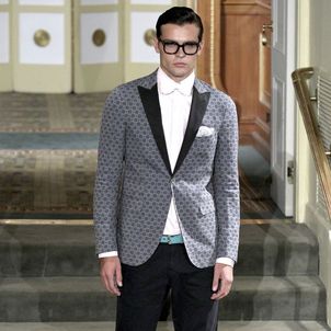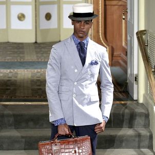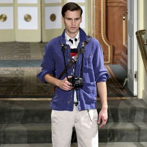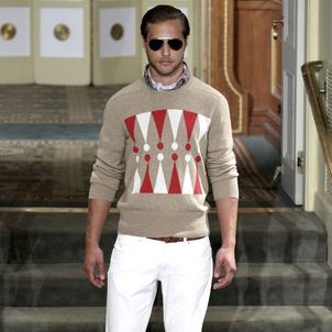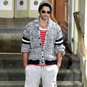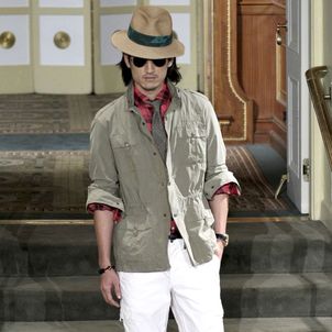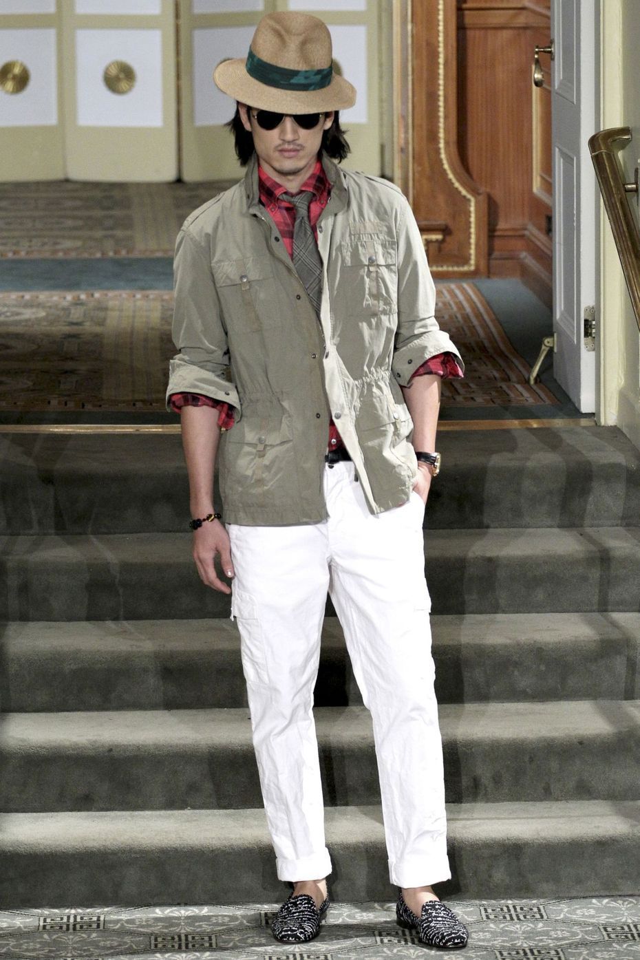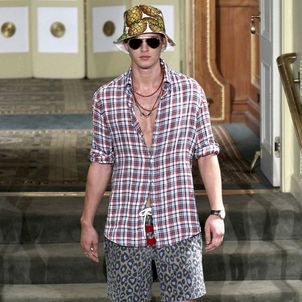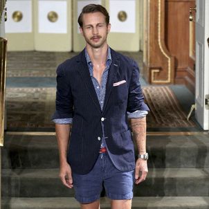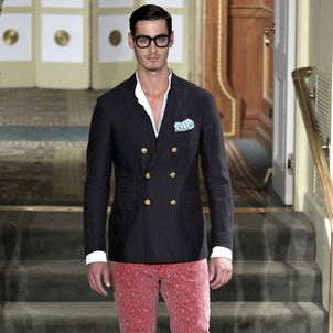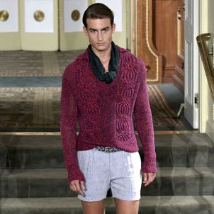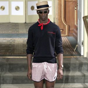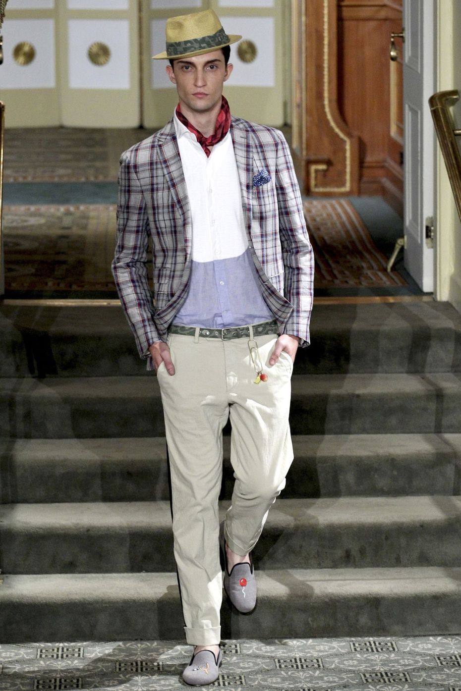 New York-born designer Michael Bastian looked to 1950 and 1960s French cinema for his latest collection. In particular, Bastian was inspired by the 1956 film The Red Balloon and the 2003 film, The Dreamers, set in Paris during the sexually-liberating 1960s. Frilly prints like pineapples on pants and cheetah patterns on jumpers and slim belts were mixed with signature Bastian pieces like rugby polos and sexy and cropped shorts.