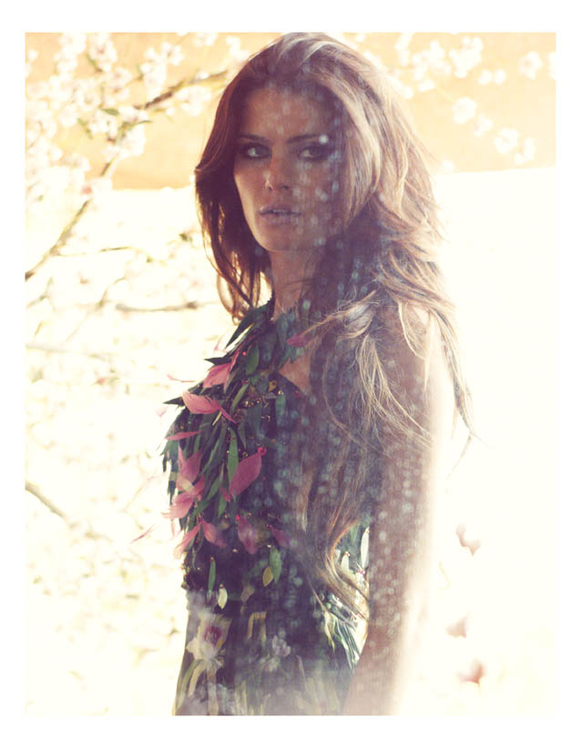 Photographed by Greg Kadel and styled by Katie Mossman, Brazilian model Isabeli Fontana appears in a fashion spread entitled "Entre Flores" in the May edition of Vogue Spain, dressed in floral themes from Roberto Cavalli, Emilio Pucci, Alexander McQueen and more.