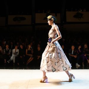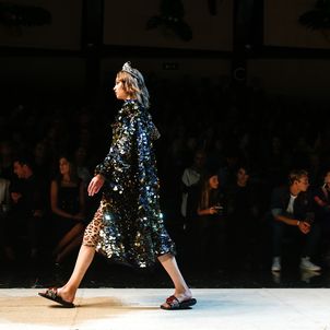 Embroidered ‘hotel’ slippers, folkloristic crowns, LED shoes, pizza heels, drum bags, pyjamas with ice cream prints. Irony is all over the collection.