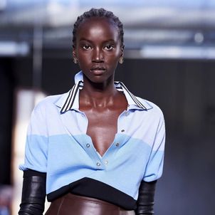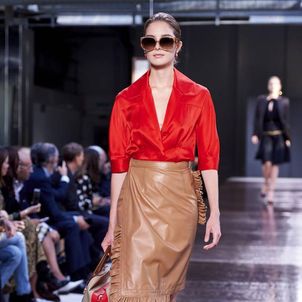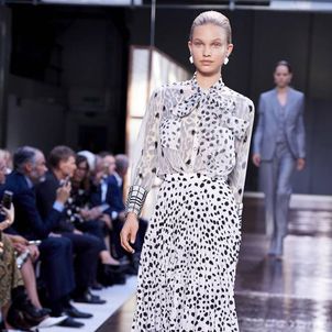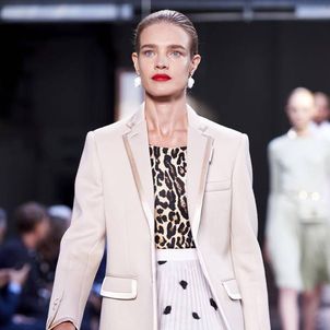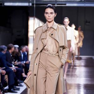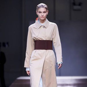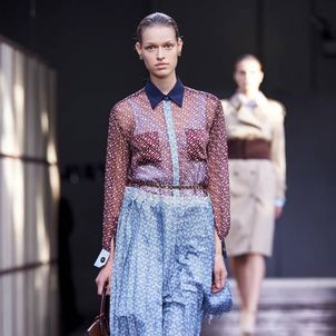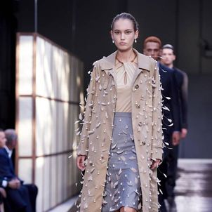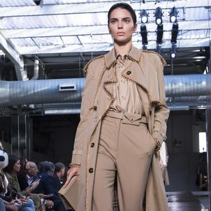The first look was, not surprisingly, a Burberry trench with a slight twist to make it Tisci's own take on what has long been a foundation of the brand's enduring popularity. The show was divided into three parts: the refined, the relaxed and evening wear. There were trench coats and car coats with cinched waists, pleated skirts and pencil shirts, and pussybow blouses for the "refined" look, which was followed by a punkier, less studied style that Tisci said was meant to capture the rebellious spirit of U.K. fashion. And finally, the evening wear, a series of spectacular, full-length black jersey dresses, some with gold detailing.