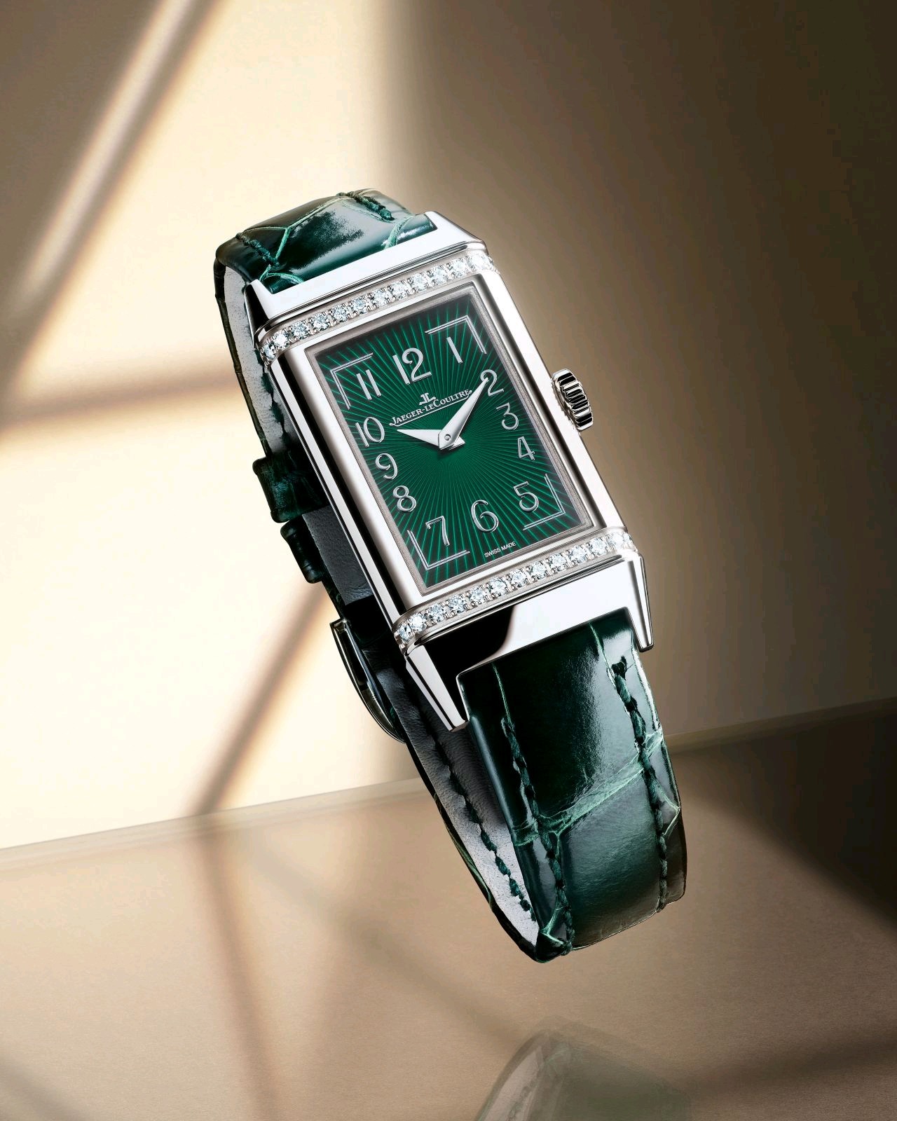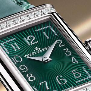 Derived from its original Art Deco design, this new timepiece introduces an interpretation of femininity in a refined style. With the deep green colour used for the first time on a Reverso dial, the beautifully understated composition of this timepiece receives a dash of fashion and modernity.