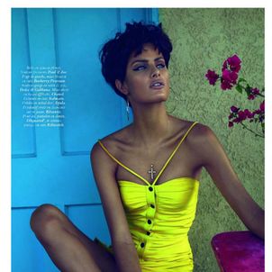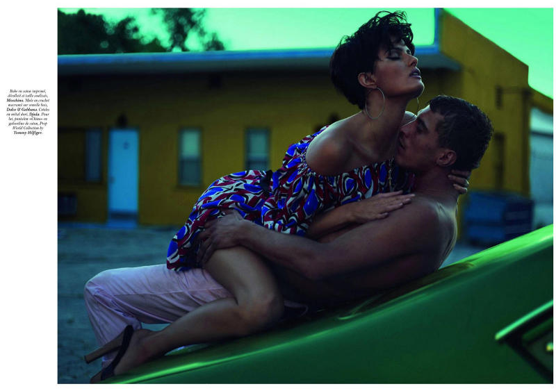 Models Isabeli Fontana and Clément Chabernaud photographed by Mert & Marcus and styled by Emmanuelle Alt for the June edition of Vogue Paris, wearing Prada, Moschino and Emilio Pucci.