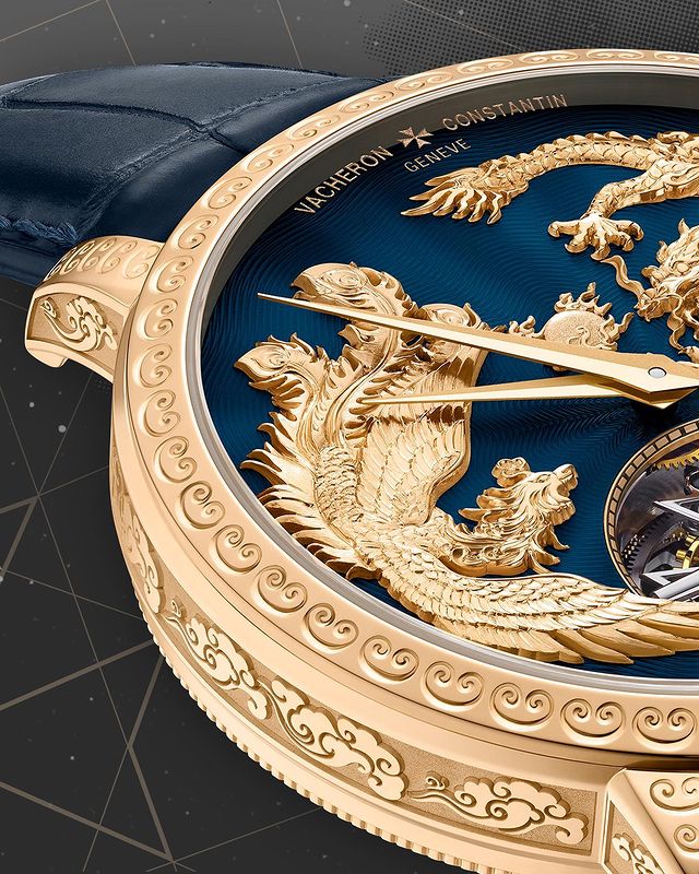 Two legendary animals, the Phoenix and the Dragon, come to life sculpted in pink gold appliques over the masterful hand-guilloché dial, available in three variations: black, deep blue and silver.