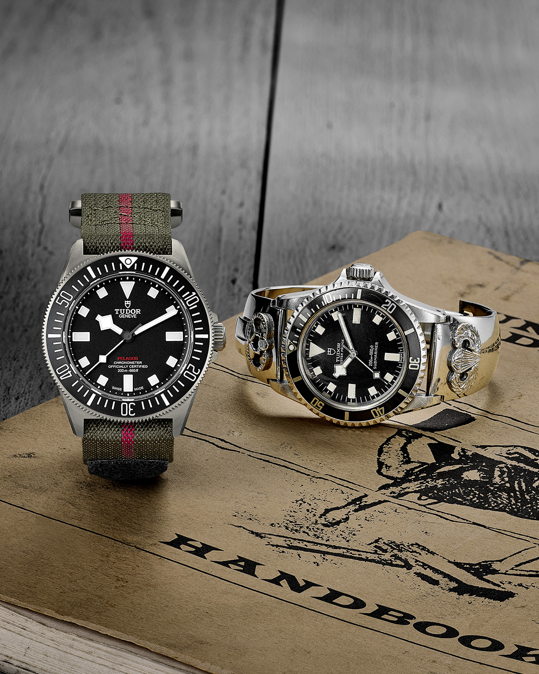 The new TUDOR Pelagos FXD, fitted on a green fabric strap, commemorates those timepieces and continues the tradition with its black dial and titanium case, bridging the gap between the past and the ever-bold future.