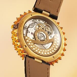 The dial, carved from orange cornelian, deepens the chromatic intensity, its rich, textured surface evoking a molten heart beneath the opaline brilliance. This is no static ornament: it is a canvas in constant dialogue with light, embodying the Maison’s philosophy of audacious elegance.