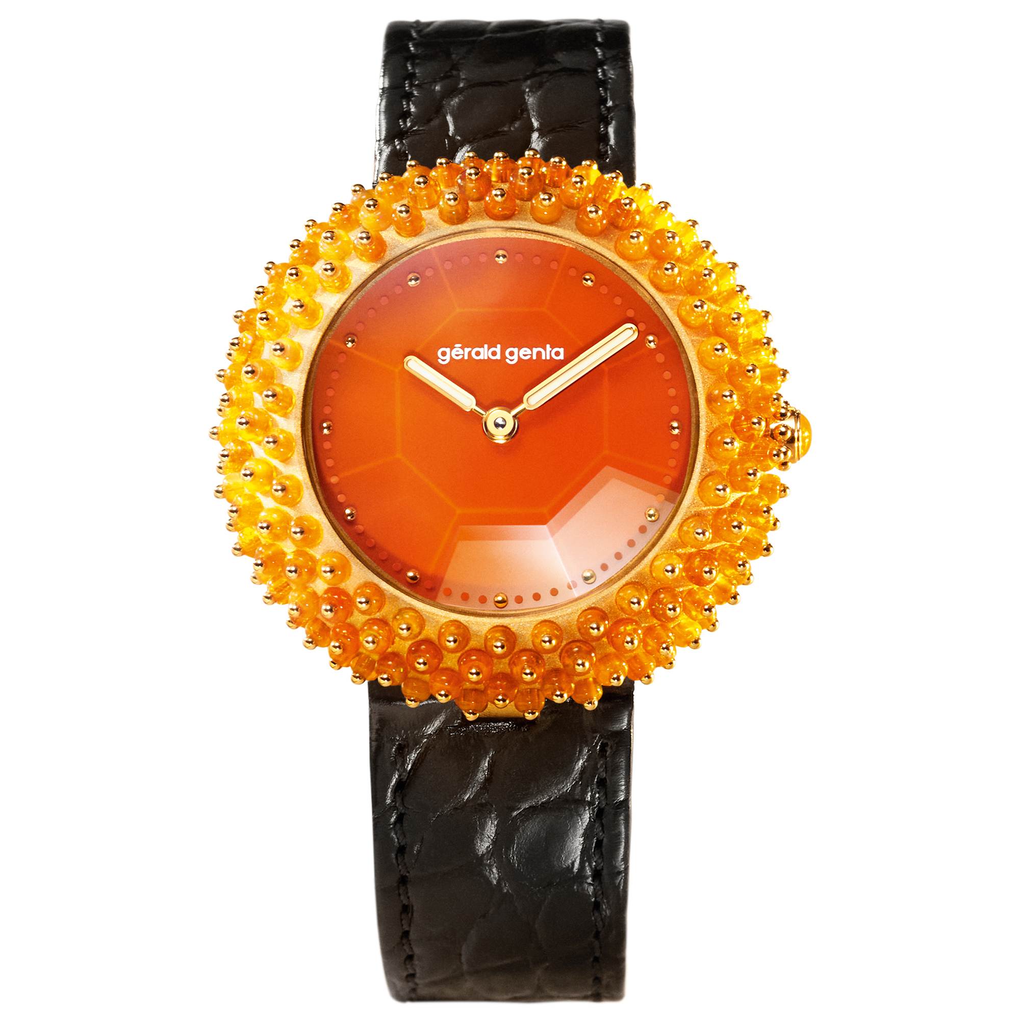 Few names in watchmaking radiate creativity quite like Gérald Genta, and the latest Gentissima Oursin Fire Opal pays luminous homage to his daring vision. Drenched in incandescent tones, the 36.5 mm yellow gold case glows with the energy of 137 fire opals — volcanic gemstones whose shifting brilliance has, for centuries, been associated with passion, artistry, and untamed energy. Each stone is meticulously set, composing a fiery mosaic that crowns the watch like a halo of living flame.