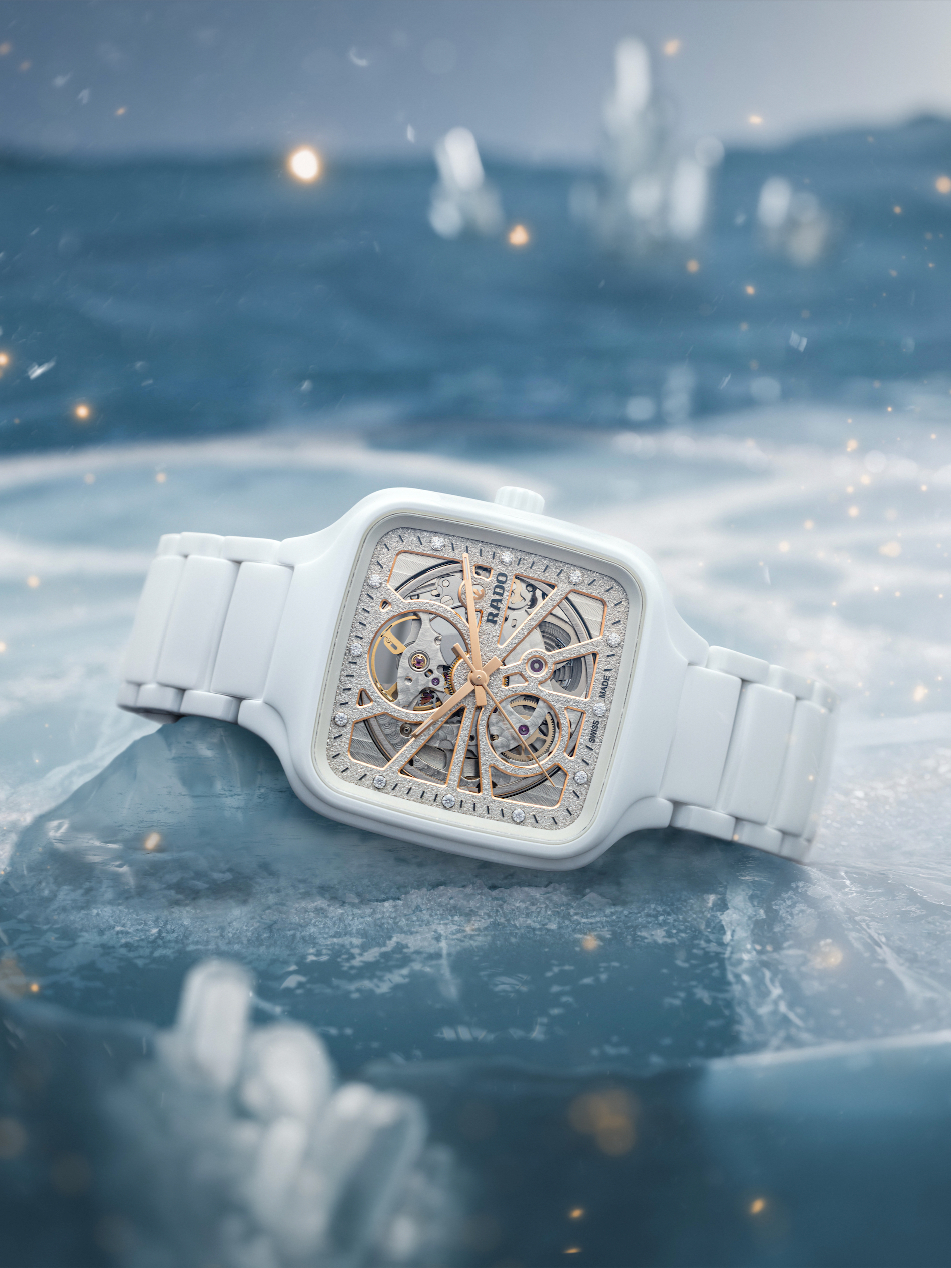 As the crisp air signals the approach of the ice and snow season , Rado celebrates this exciting time with a magnificent, scintillating display of diamonds, light, and the masterful artistry of high-tech ceramic. Introducing two new True Square Open Heart models , these festive beauties make their debut glittering with sparkling diamonds and encased in either polished white or polished plasma high-tech ceramic, complemented by matching bracelets.