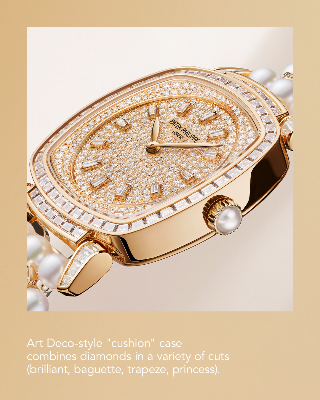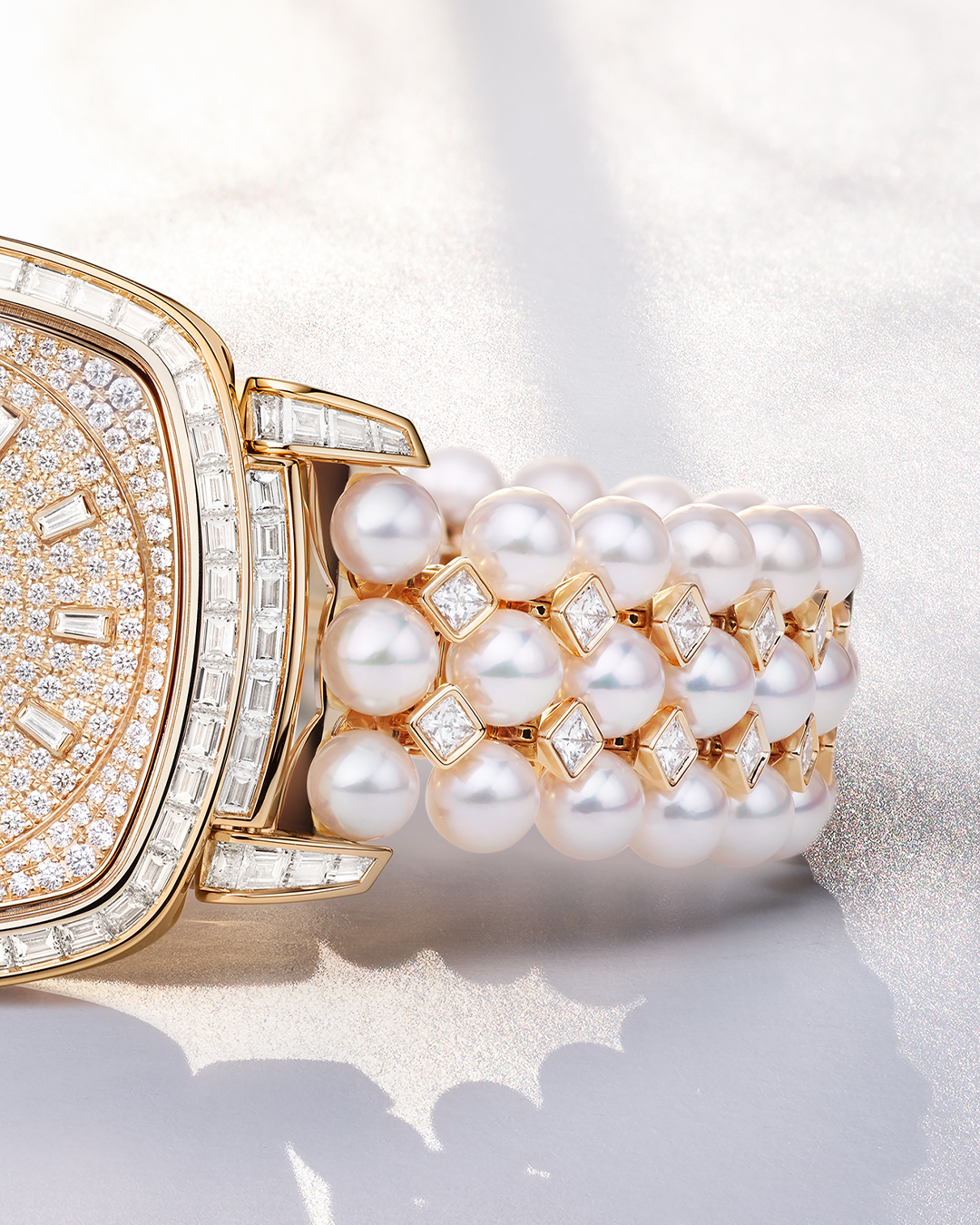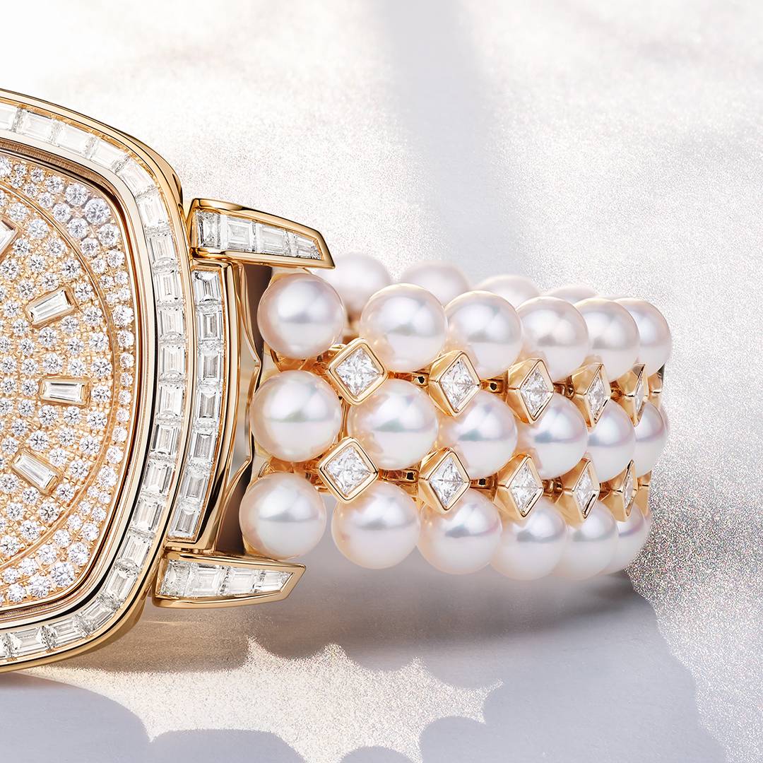 There is a certain architectural magic that occurs when the structural rigor of Art Deco meets the soft, organic luster of the sea. The Patek Philippe Gondolo Ref. 7042/100 emerges as a masterwork of this aesthetic duality, featuring a rose gold cushion case that feels both nostalgic and profoundly modern. It is a piece defined by a lavish tapestry of stones, where the sharp geometry of baguette, trapeze, and princess-cut diamonds finds a surprising partner in the creamy perfection of Akoya pearls. With a total of 552 diamonds and 79 pearls carefully choreographed across its surface, the watch transcends mere timekeeping to become a wearable sculpture of light.