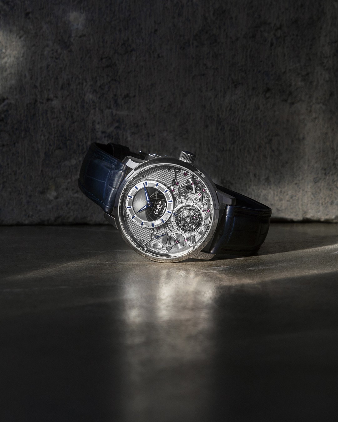 For the first time in history, the Flying Tourbillon—an invention born in Glashütte in 1920—has been harmonized with a second-stop mechanism, zero reset, and minute detent to allow for absolute precision in time setting. This complex construction is so revolutionary that two patents have been filed to protect its ingenuity, marking a bold new chapter in the 180 year success story of the Maison.