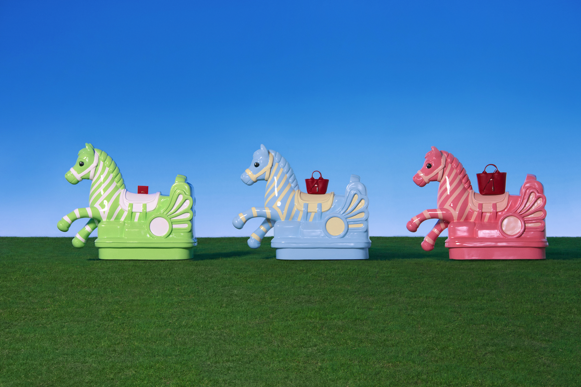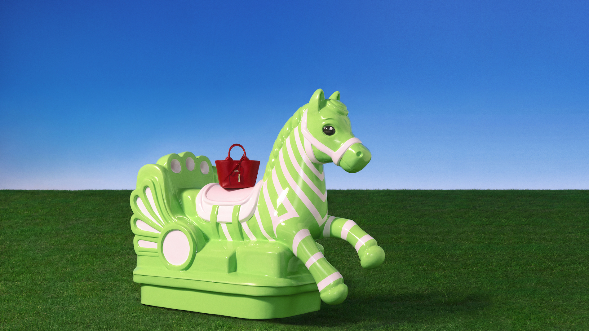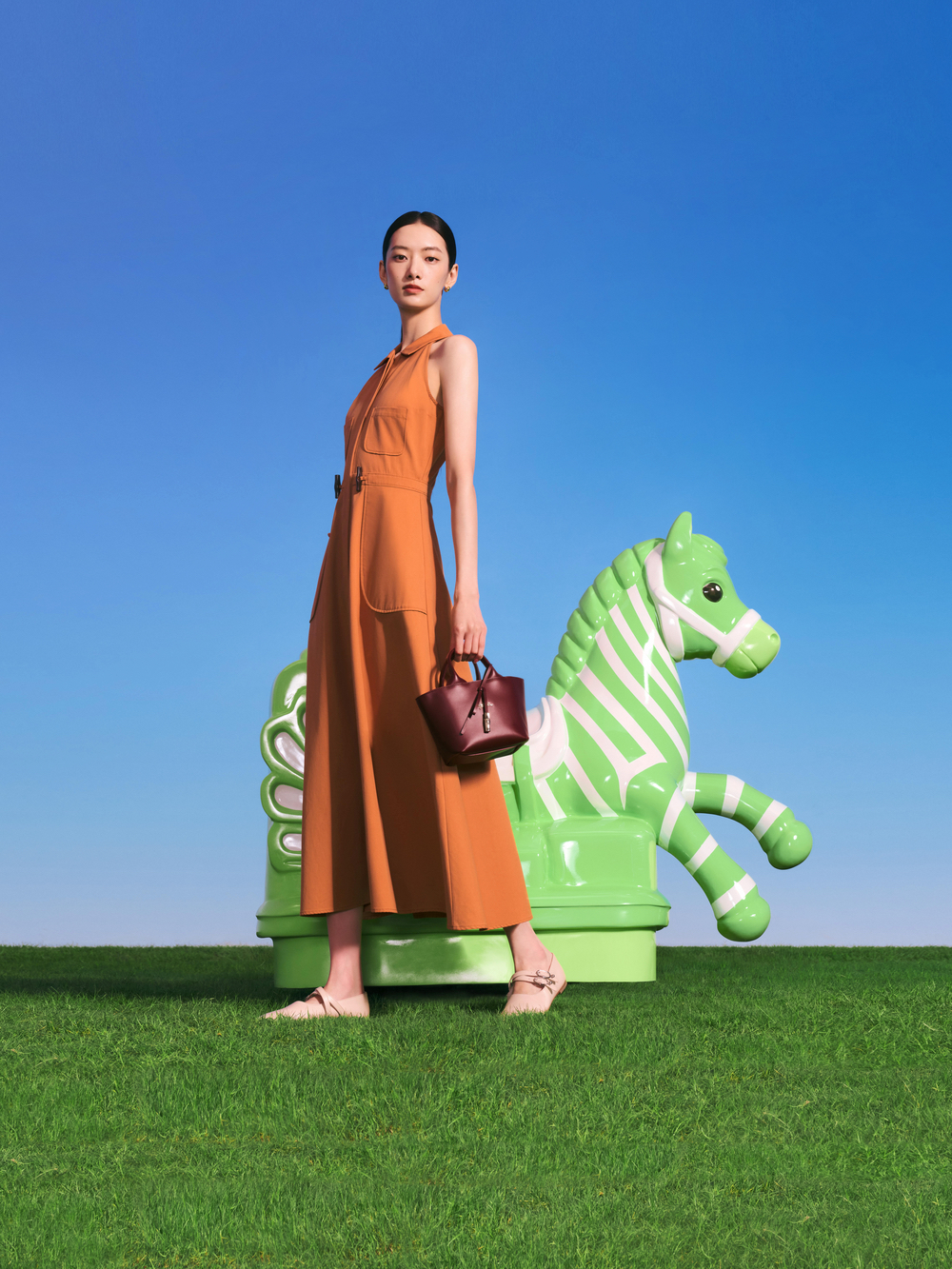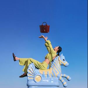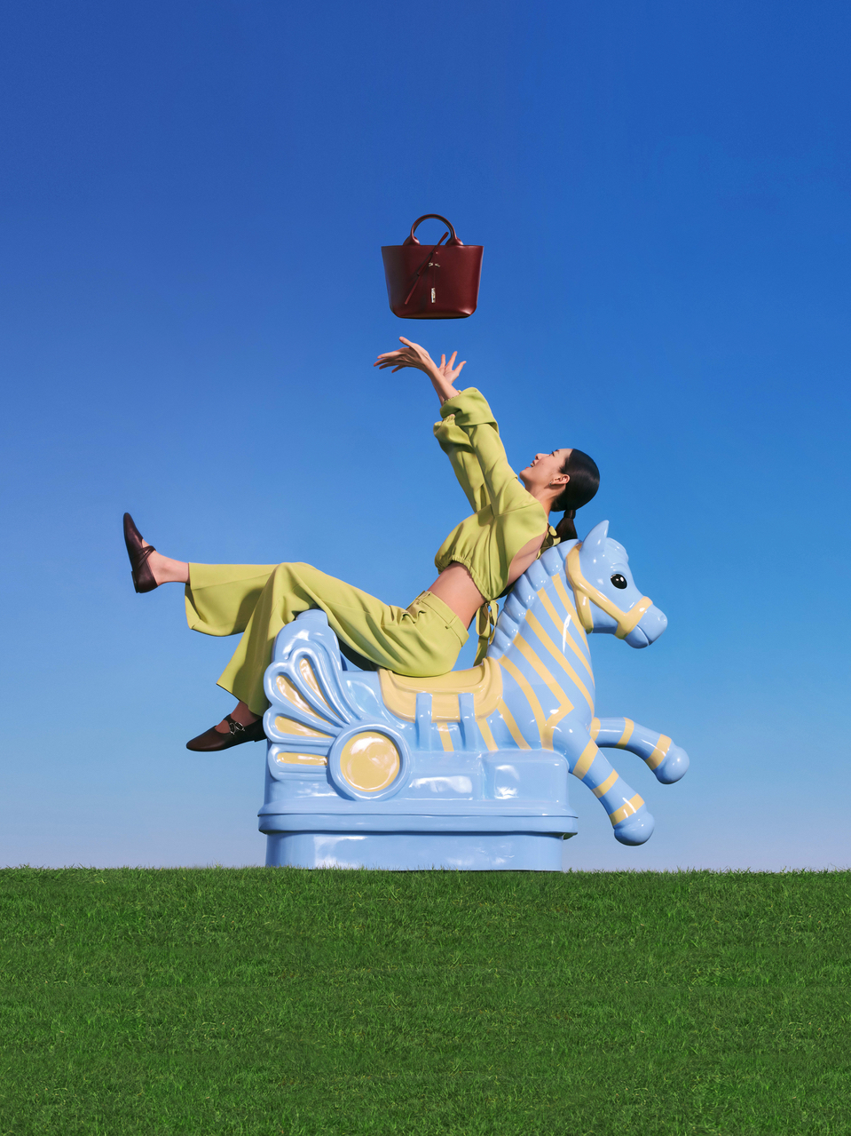 The accompanying campaign, titled Riding the Spring Breeze, stars top model Cici Xiang and was captured by photographer Leslie Zhang. The visuals reveal a poetic and pop-inflected universe featuring reinvented horses that invite a nostalgic journey back to childhood. Set against a tongue-in-cheek décor of dazzling blue skies and bright green grass, the campaign reflects the sense of optimism and renewal that defines both the change of seasons and the core values of Longchamp.