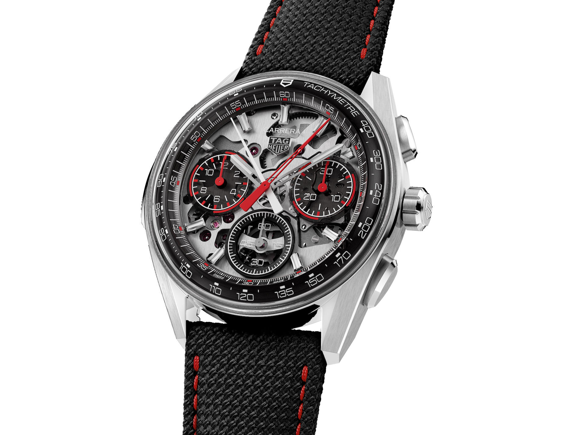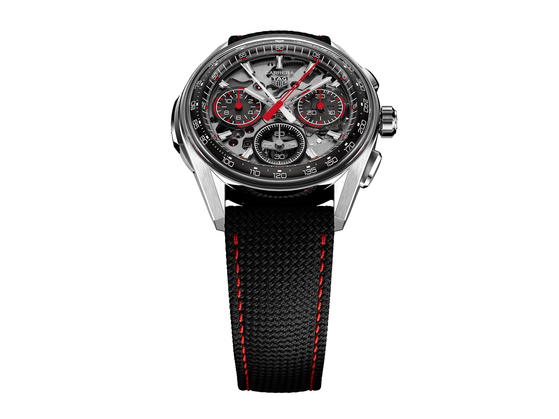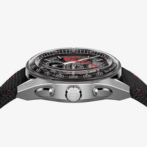 Beating at a high frequency of 5Hz, the movement ensures peak precision and offers a 65-hour power reserve. The watch is completed with a black rubber strap featuring textile embossing and red stitching, secured by a titanium folding clasp. This exceptional addition to the TAG Heuer Carrera family is scheduled for availability in June 2026.