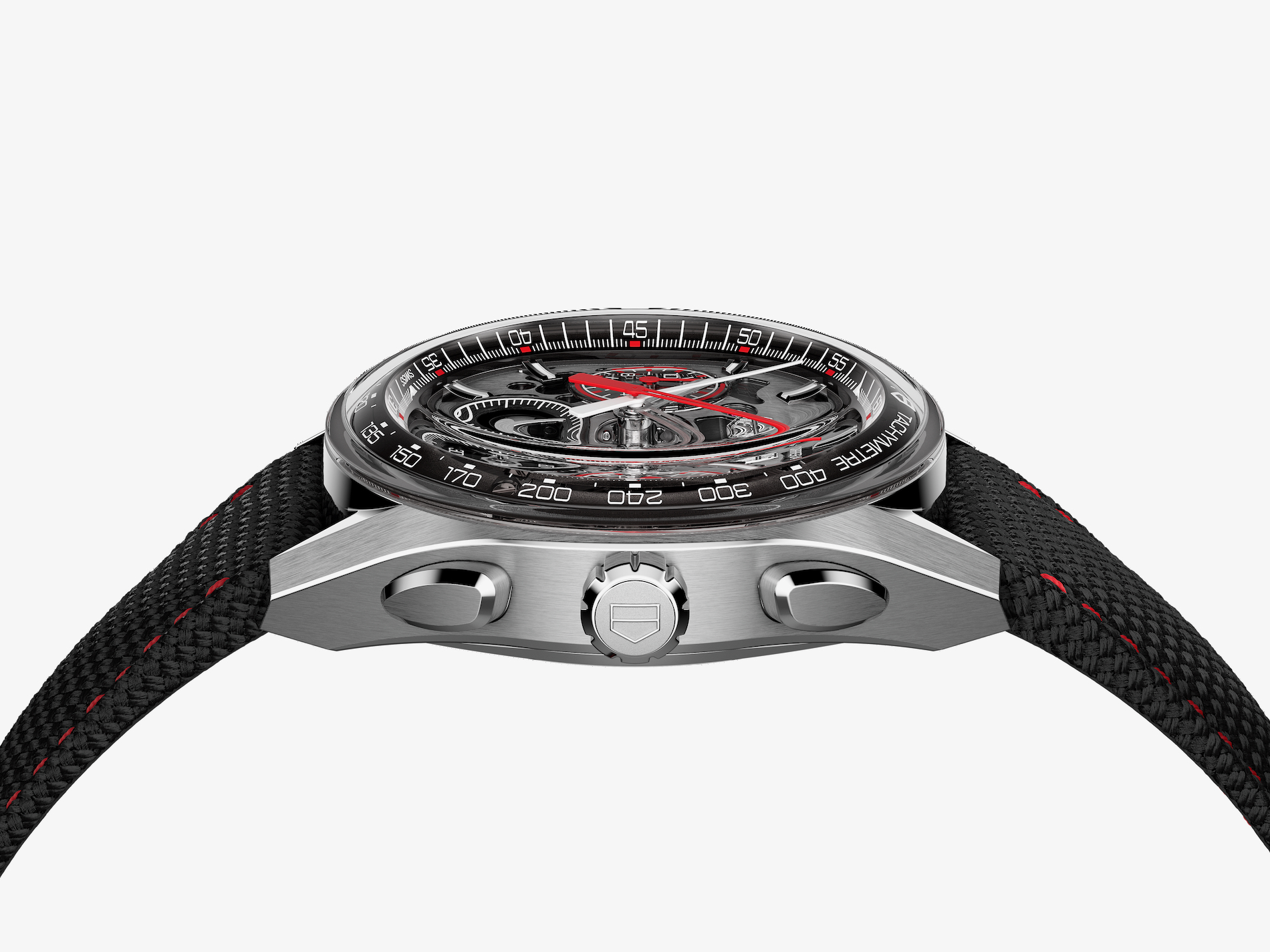 At the heart of the watch lies the Calibre TH81-01, a movement developed in collaboration with Vaucher Manufacture Fleurier. Comprised of more than 350 components, this grade-5 titanium engine is finished entirely by hand using over ten distinct techniques, including black polishing and hand-beveling. It is crowned with a signature hand-engraved checkered flag pattern and an oscillating weight shaped like the TAG Heuer shield.