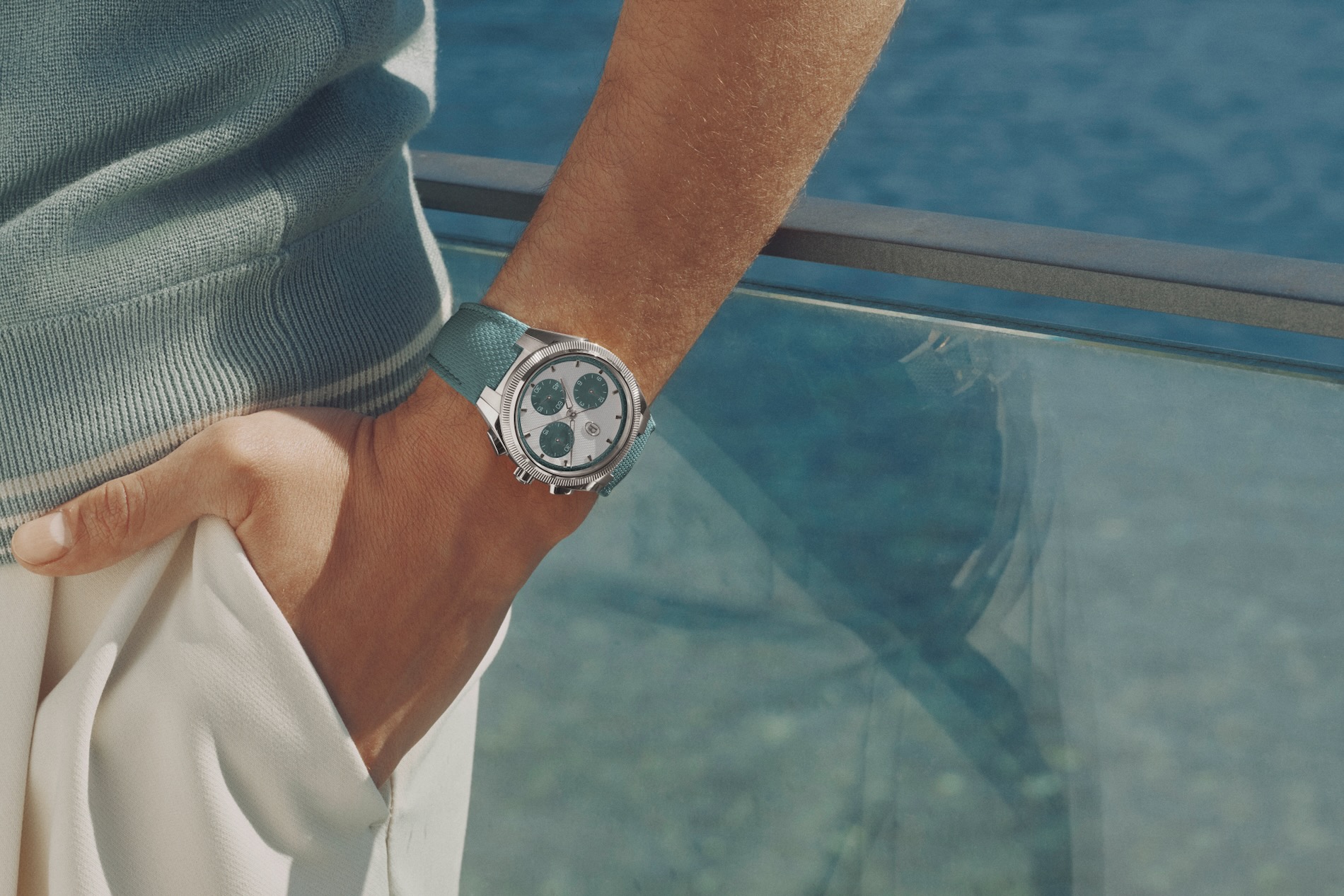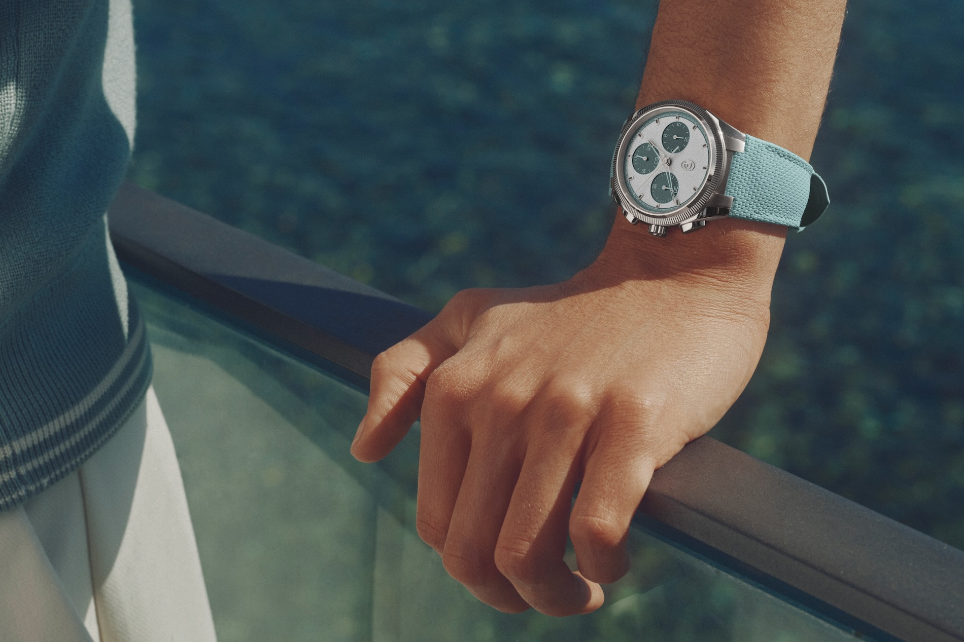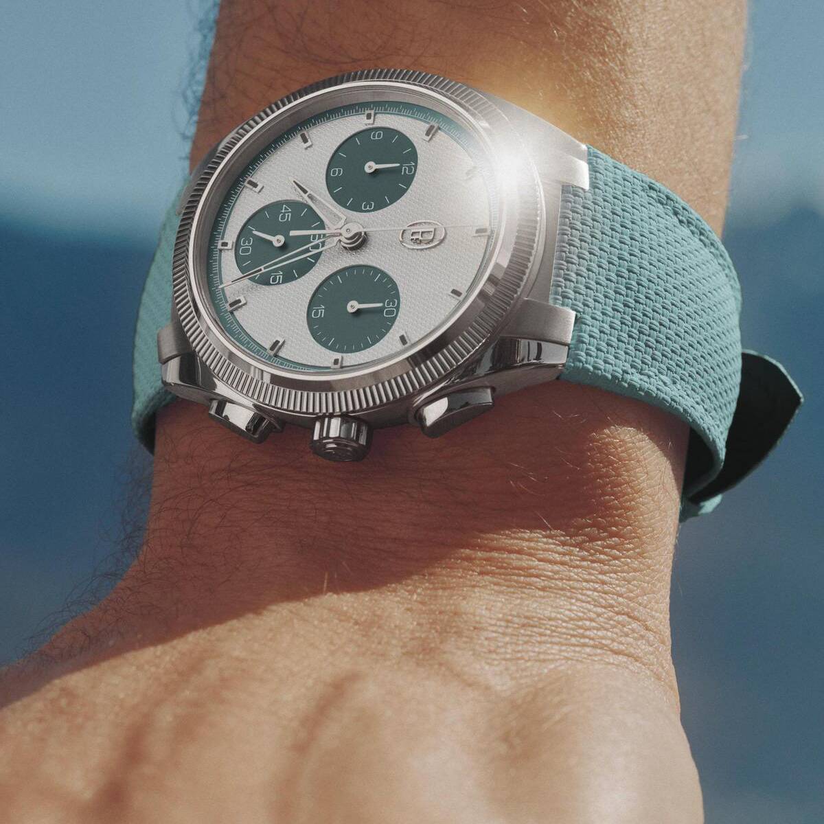 Beneath the sapphire glass, the silver dial features a "clou triangulaire" guilloché finish and sub-dials rendered in a distinctive "Verzasca" hue. The hands are crafted from 18ct gold with a rhodium plating, skeletonized into a delta shape and coated with black luminescent material for effortless reading. This refined aesthetic is mirrored by the rubber strap, which uses a multi-layer construction inspired by fine saddlery to offer a level of comfort rarely achieved in high-performance watches.