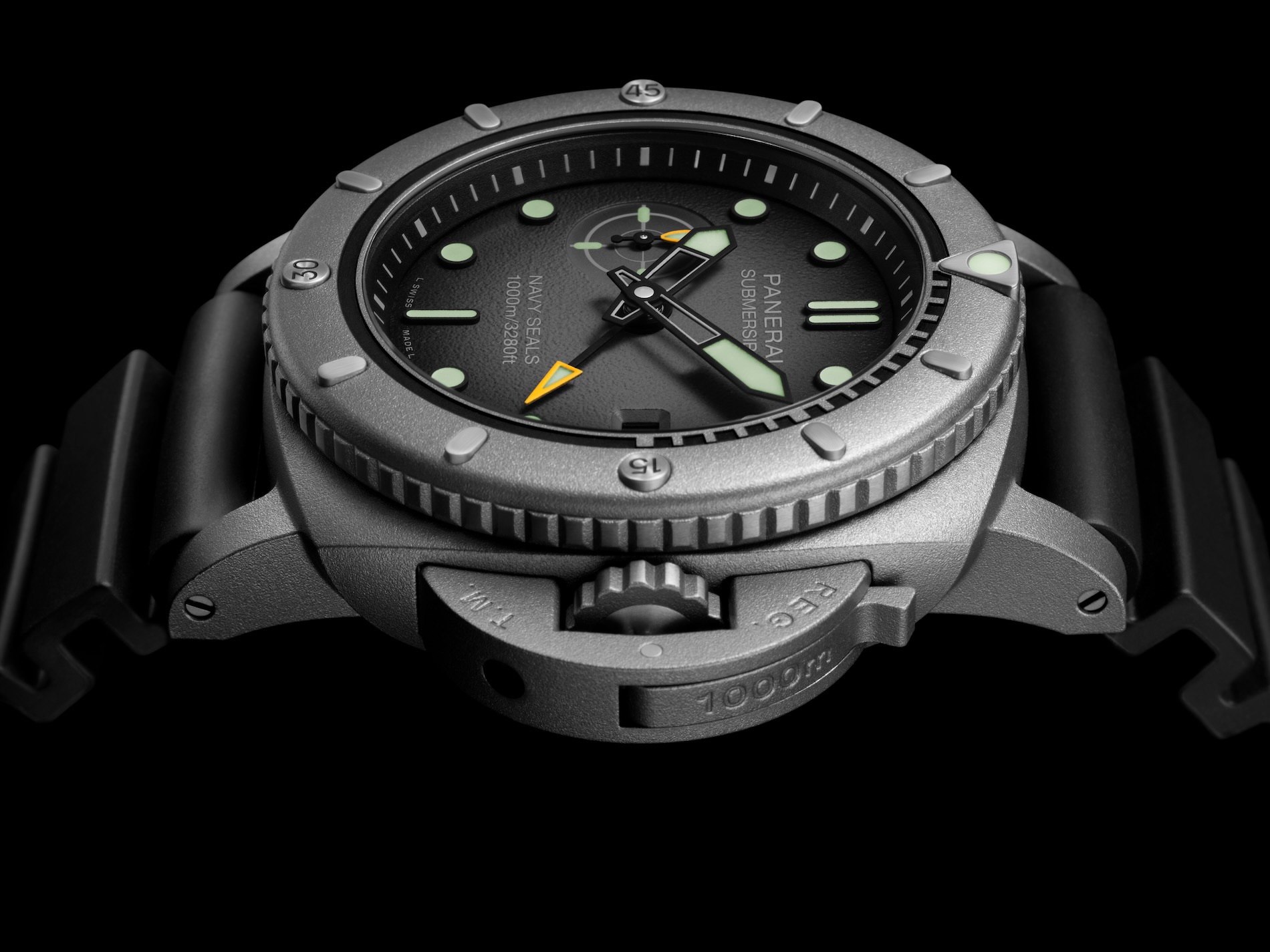 The 47mm sandblasted case possesses a singular silver-grey tone with subtle bluish nuances, setting it apart from conventional metals. The sandblasted finish is not merely aesthetic but ensures the watch remains non-reflective underwater. Building on decades of expertise, this timepiece achieves an outstanding water resistance of up to 100 bar, or approximately 1000 meters.