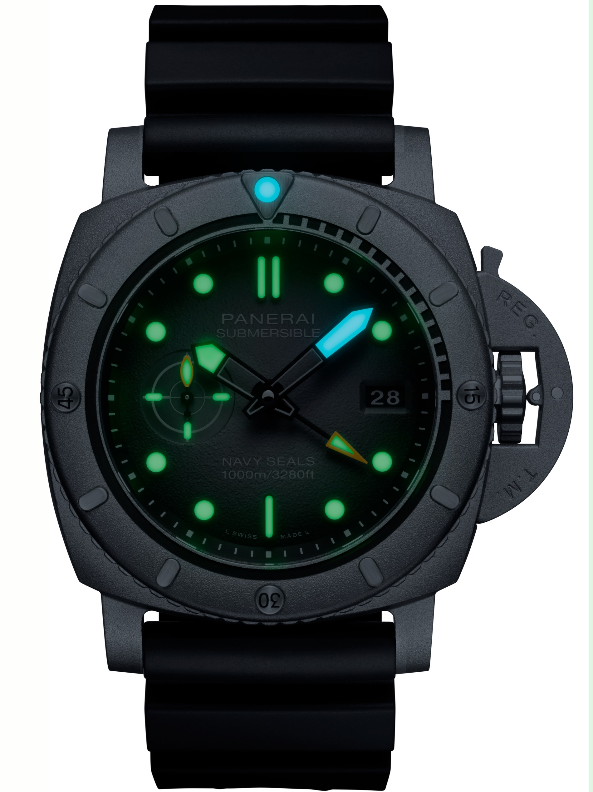 Within this powerful structure, the unidirectional rotating bezel serves as a true operational tool. It features distinctive indexes glowing in blue and a triangular marker at 12 o’clock to ensure immediate orientation even in low-visibility conditions. For instinctive readability during dives, the dial elements use distinct luminous colors, with the minute hands glowing in blue while all remaining elements are illuminated in green.