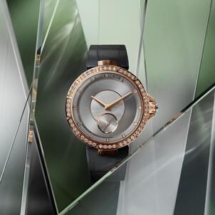 The timepiece is housed in a 36mm rose gold case shaped like a jewel, reflecting a daring aesthetic and technical execution. The Sovereign Grey dial serves as a symbol of armour, conveying Viviane’s courage and strength of character. These shades of grey evoke both her chivalry and the indestructible weapon forged in the enchanted world.