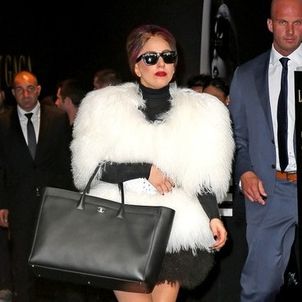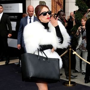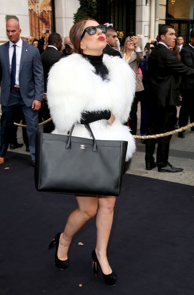 At Sephora Champs-Elysees Paris, Lady Gaga was spotted carrying the Chanel XL Cerf Tote bag (or even XXL) while promoting her new fragrance ‘Fame’. She’s been under some criticism for admittedly carrying on a few pounds; however, not to let her critics let her down donned a white feather jacket and what appears to be the largest Cerf Tote Chanel ever made.