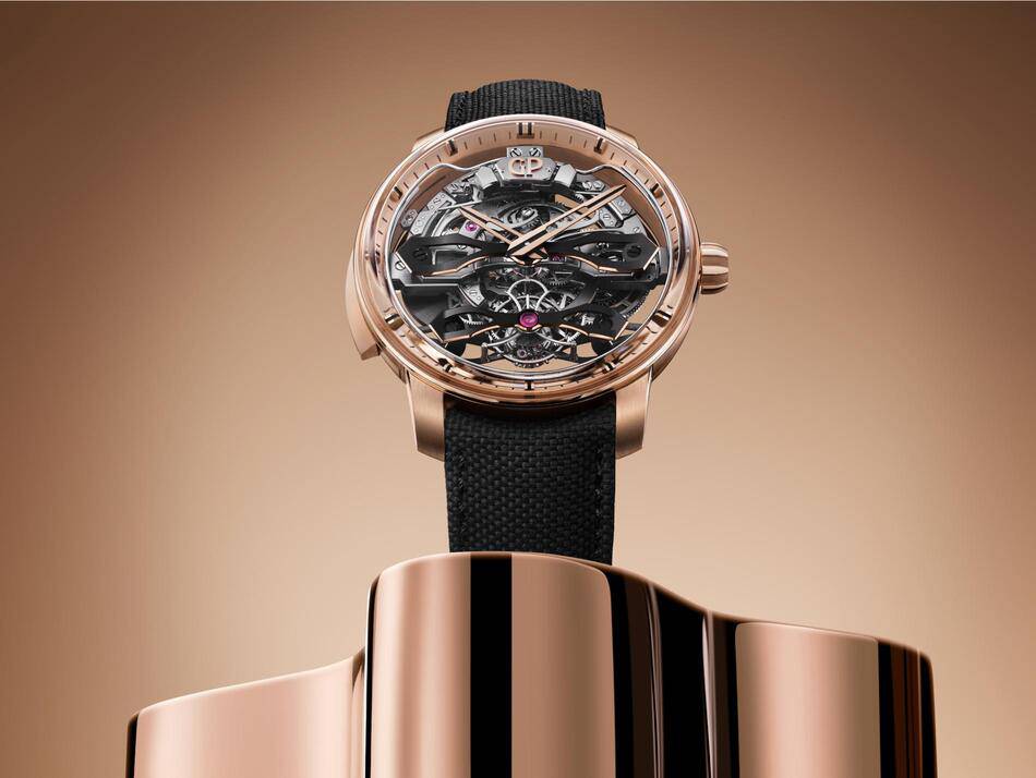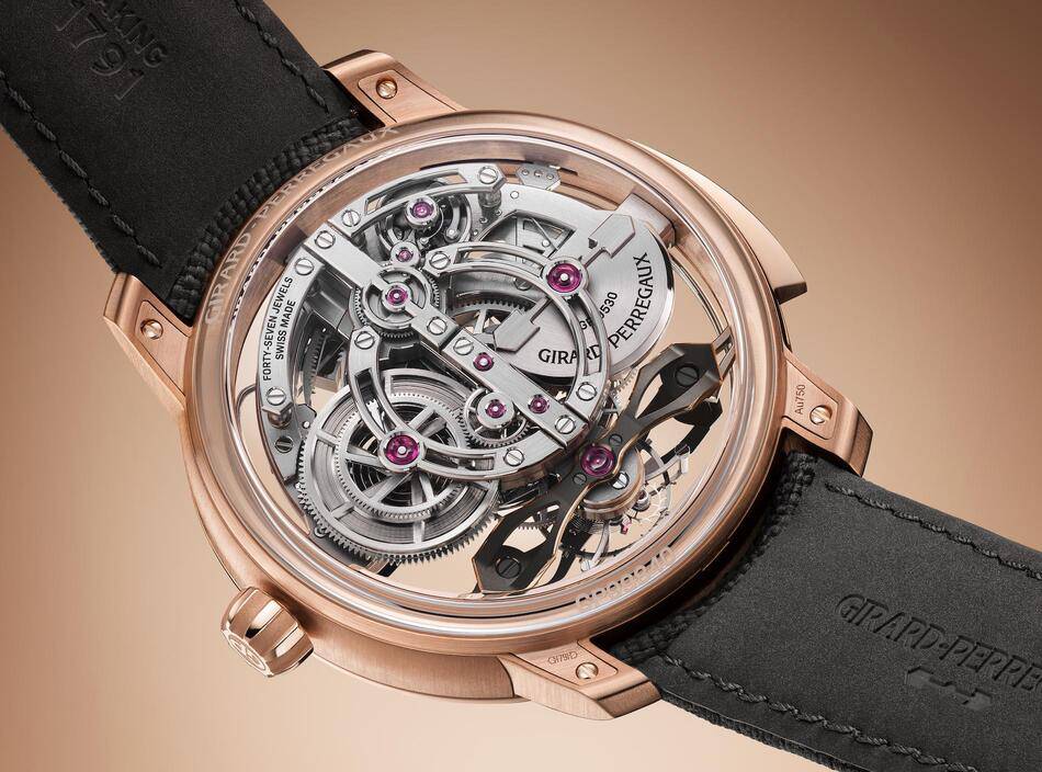 Girard-Perregaux has reinterpreted its iconic Three Bridges architecture for the modern era, using pink gold "flying" bridges to suspend the movement in a state that appears almost like levitation. This airy, openworked structure is as much about acoustic performance as it is about visual allure. Because the titanium plate and bridges facilitate the pure propagation of sound, the chiming melody of the hours and minutes resonates with a crystalline clarity that is entirely unimpeded.