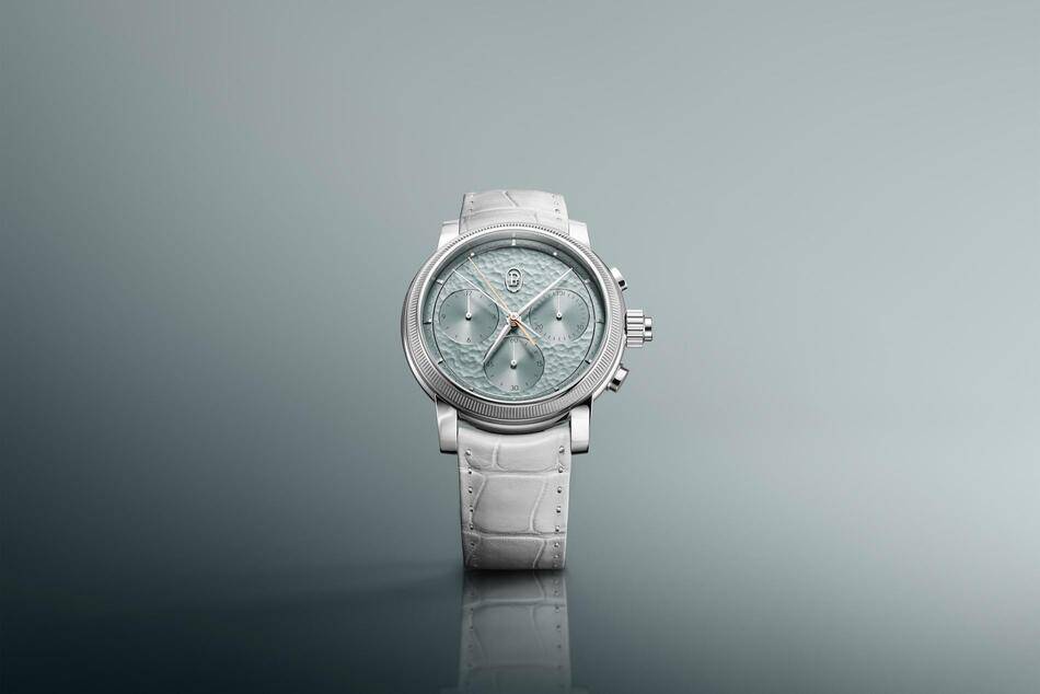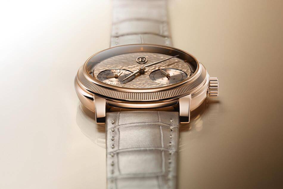 Creating a Parmigiani hammered dial is a demanding process spanning around sixty individual operations. To provide contrast, the counters are finished through a delicate azuré process where fine grooves are cut using diamond tools to capture light with precision.