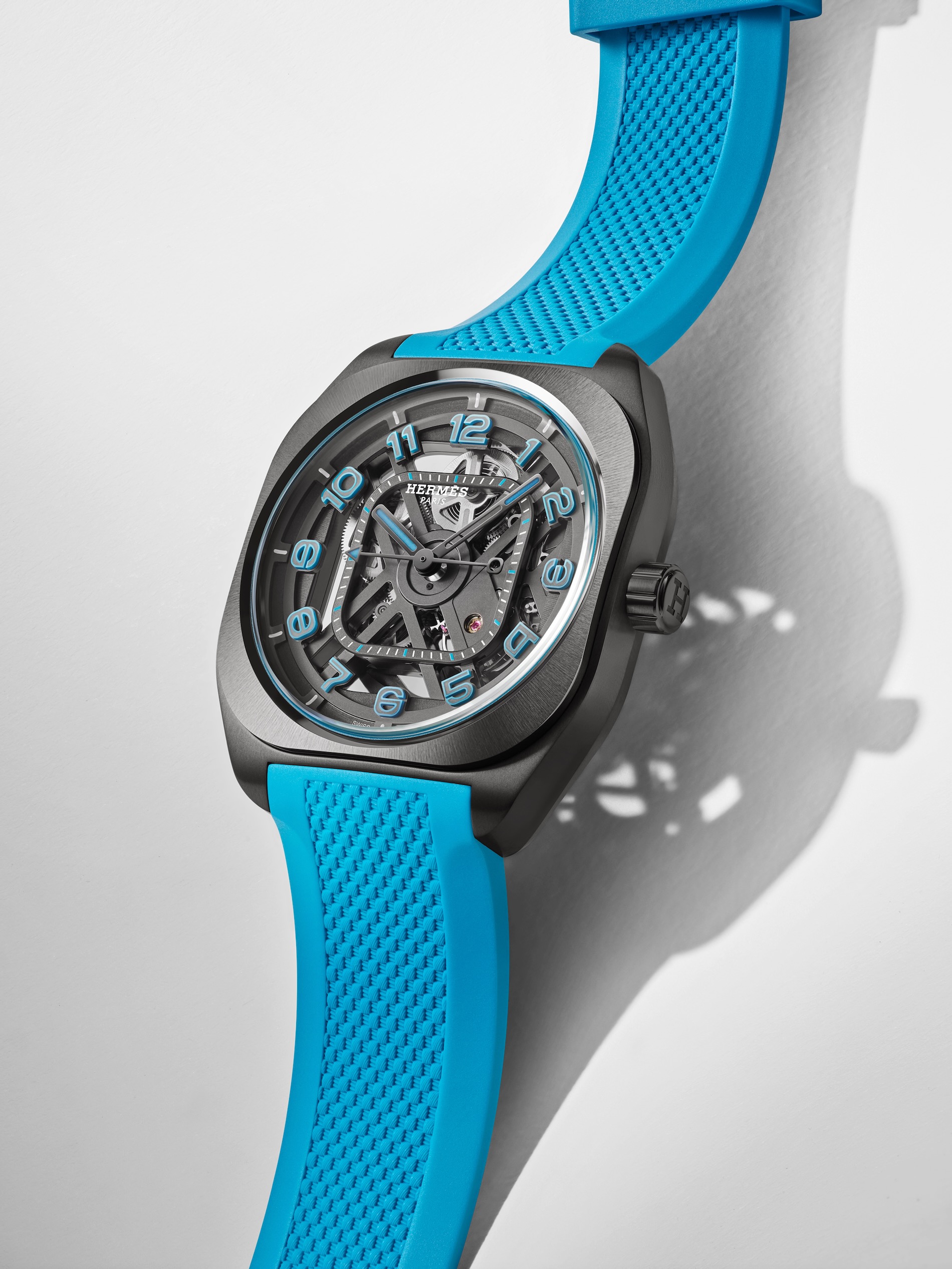 Vanishing lines and gears guide the eye to the heart of the new Hermès H1978 S skeletonised titanium calibre. The components interlock and overlap, inviting the gaze to venture through the structures of time. This graphic model features a structured, woven-patterned rubber strap matching the shades specific to each version, such as the intense Bleu Zanzibar.